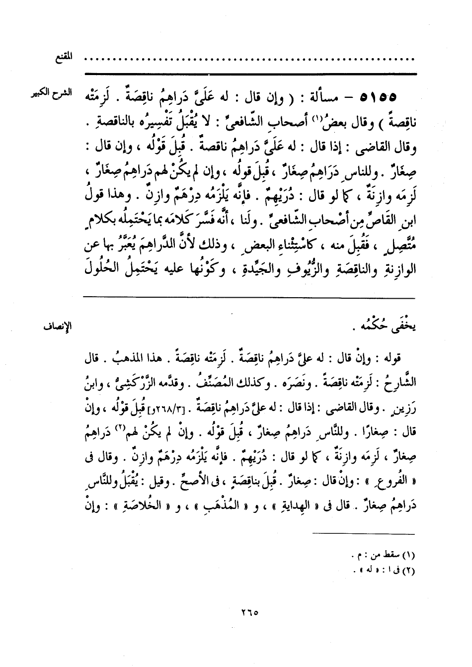 قوله: وإنْ قال: له علىَّ دَراهِمُ ناقِصَةٌ. لَزِمَتْه ناقِصَةً. هذا المذهبُ. قال الشَّارِحُ: لَزِمَتْه ناقِصَةً. ونَصَرَه. وكذلك المُصَنِّفُ. وقدَّمه الزَّرْكَشِىُّ، وابنُ رَزِينٍ. وقال القاضى: إذا قال: له علىَّ دَراهِمُ ناقِصَةٌ. قُبِلَ قوْلُه، وإنْ قال: صِغارًا. وللنَّاسِ دَراهِمُ صِغارٌ، قُبِلَ قوْلُه. وإنْ لم يكُنْ لهم (¬1) دَراهِمُ صِغارٌ، لَزِمَه وازِنَةٌ، كما لو قال: دُرَيْهِمٌ. فإنَّه يَلْزَمُه دِرْهَمٌ وازِنٌ. وقال فى «الفُروعِ»: وإنْ قال: صِغارٌ. قُبِلَ بناقِصَةٍ، فى الأصحِّ. وقيل: يُقْبَلُ وللنَّاسِ دَراهِمُ صِغارٌ. قال فى «الهِدايَةِ»، و «المُذْهَبِ»، و «الخُلاصَةِ»: وإنْ