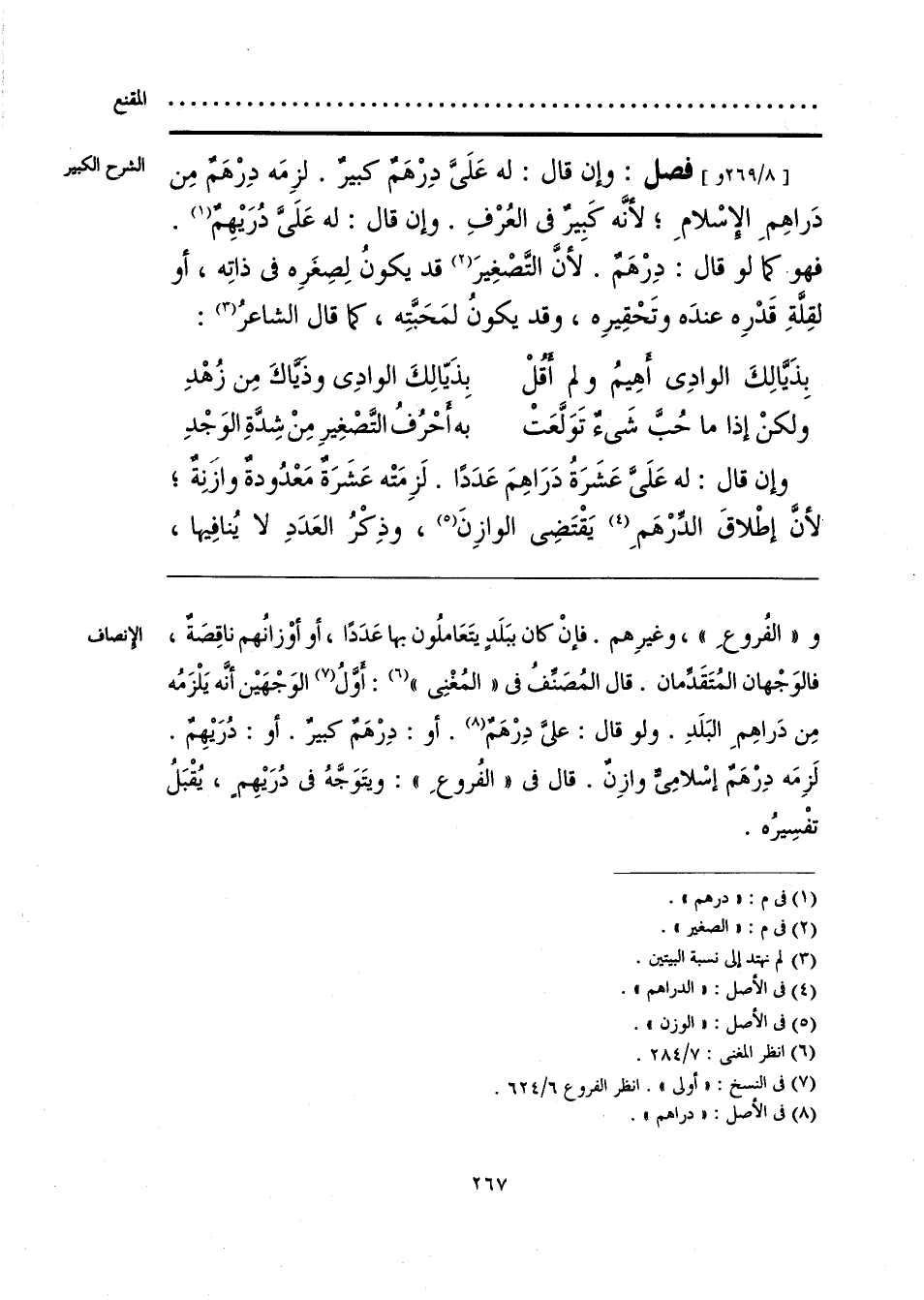 و «الفُروعِ»، وغيرِهم. فإنْ كان ببَلَدٍ يتَعَاملُون بها عَدَدًا، أو أوْزانُهم ناقِصَةٌ، فالوَجْهان المُتَقَدِّمان. قال المُصَنِّفُ فى «المُغْنِى» (¬1): أَوَّلُ (¬2) الوَجْهَيْن أنَّه يَلْزَمُه مِن دَراهِمِ البَلَدِ. ولو قال: علىَّ دِرْهَمٌ (¬3). أو: دِرْهَمٌ كبيرٌ. أو: دُرَيْهِمٌ. لَزِمَه دِرْهَمٌ إسْلامِىٍّ وازِنٌ. قال فى «الفُروعِ»: ويتَوَجَّهُ فى دُرَيْهِمٍ، يُقْبَلُ تفْسِيرُه.