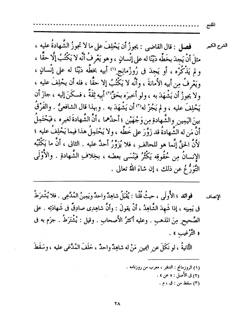 فوائد؛ الأولَى، حيثُ قُلْنا: يُقْبَلُ شاهِدٌ واحدٌ ويَمِينُ المُدَّعِى. فلا يُشترطُ فى يَمِينه، إذا شَهِدَ الشاهِدُ، أنْ يقولَ: وأن شاهِدِى صادِق فى شَهادَتِه. على الصَّحيحِ مِنَ المذهبِ. وعليه أكثر الأصحابِ. وقيل: يُشْتَرَطُ. جزَم به فى «الترغيب».