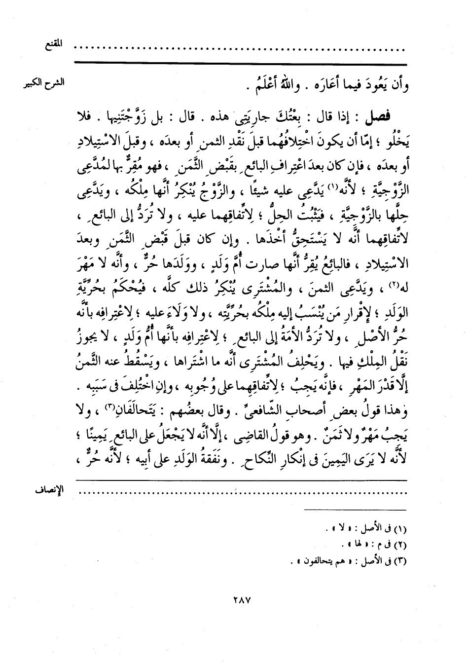 فصل: إذا قال: بِعْتُكَ جارِيَتِى. هذه. قال: بل زَوَّجْتَنِيها. فلا يَخْلُو؛ إمّا أن يكونَ اخْتِلافُهُما قبلَ نَقْدِ الثمنِ أو بعدَه، وقبلَ الاسْتِيلادِ أو بعدَه، فإن كان بعدَ اعْتِرافِ البائعِ بقَبْضِ الثَّمَنِ، فهو مُقِرٌّ بها لمُدَّعِى الزَّوْجِيَّةِ؛ لأنَّه (¬1) يَدَّعِى عليه شيئًا، والزَّوْجُ يُنْكِرُ أنَّها مِلْكُه، ويَدَّعِى حِلَّها بالزَّوْجيَّةِ، فيَثْبُتُ الحِلُّ؛ لِاتِّفاقِهما عليه، ولا تُرَدُّ إلى البائعِ، لاتِّفاقِهما أنَّه لا يَستَحِقُّ أخْذَها. وإن كان قبلَ قَبْضِ الثَّمَنِ وبعدَ الاسْتِيلادِ، فالبائِعُ يُقِرُّ أنَّها صارت أُمَّ وَلَدٍ، ووَلَدَها حُرٌّ، وأنَّه لا مَهْرَ له (¬2)، ويَدَّعِى الثمنَ، والمُشْتَرِى يُنْكِرُ ذلك كلَّه، فيُحْكَمُ بحُرِّيَّةِ الوَلَدِ؛ لإِقْرارِ مَن يُنْسَبُ إليه مِلْكُه بحُرِّ. ليه، ولا وَلَاءَ عليه؛ لِاعْتِرافِه بأنَّه حُرُّ الأَصْلِ، ولا تُرَدُّ الأمَةُ إلى البائعِ؛ لِاعْتِرافِه بأنَّها أُمُّ وَلَدٍ، لا يجوزُ نَقْلُ المِلْكِ فيها. ويَحْلِفُ المُشْتَرِى أنَّه ما اشْتَراها، ويَسْقُطُ عنه الثَّمنُ إلَّا قَدْرَ المَهْرِ، فإنَّه يَجِبُ؛ لِاتِّفاقِهِما على وُجُوبِه، وإنِ اخْتُلِفَ في سَبَبِه. وهذا قولُ بعضِ أصحابِ الشّافعىِّ. وقال بعضُهم: يَتَحالَفَانِ (¬3)، ولا يَجبُ مَهْرٌ ولا ثَمَنٌ. وهو قولُ القاضِى، إلَّا أنَّه لا يَجْعَلُ على البائعِ يَمِينًا؛ لأَنَّه لا يَرَى اليَمِينَ في إنْكارِ النِّكاحِ. ونَفَقةُ الوَلَدِ على أبِيه؛ لأنَّه حُرٌّ،