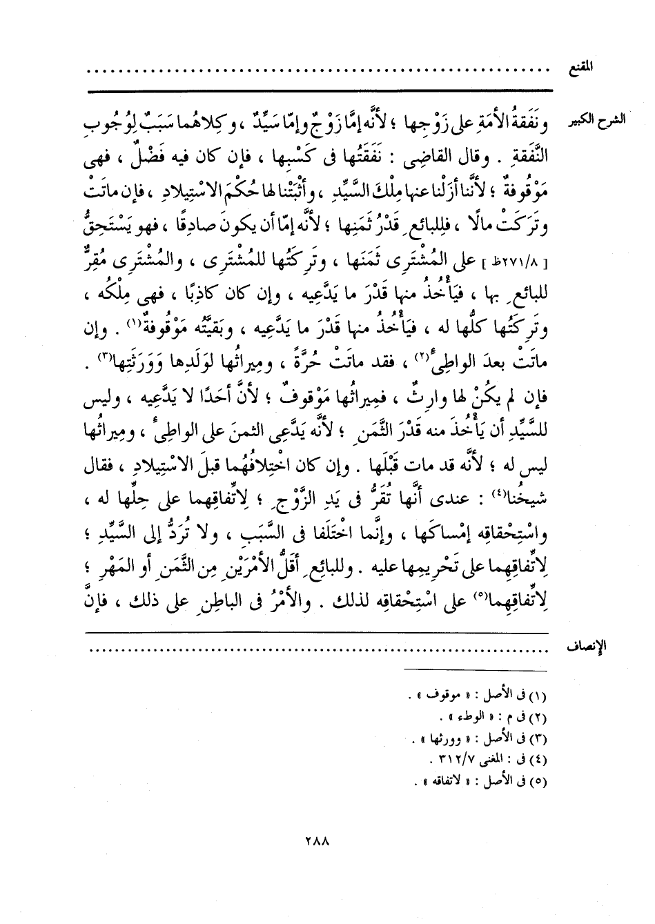 ونَفَقةُ الأمَةِ على زَوْجِها؛ لأنَّه إمَّا زَوْجٌ وإمّا سَيِّدٌ، وكِلاهُما سَبَبٌ لِوُجُوبِ النَّفَقةِ. وقال القاضِى: نَفَقَتُها في كَسْبِها، فإن كان فيه فَضْلٌ، فهى مَوْقُوفةٌ؛ لأنَّنا أزَلْنا عنها مِلْكَ السَّيِّدِ، وأثْبَتْنا لها حُكْمَ الاسْتِيلادِ، فإن ماتَت وتَرَكَتْ مالًا، فلِلبائعِ قَدْرُ ثَمَنِها؛ لأنَّه إمّا أن يكون صادِقًا، فهو يَسْتَحِقُّ على المُشْتَرِى ثَمَنَها، وتَرِكَتُها للمُشْتَرِى، والمُشْتَرِى مُقِرٌّ للبائعِ بها، فيَأْخُذُ منها قَدْرَ ما يَدَّعِيه، وإن كان كاذِبًا، فهى مِلْكُه، وتَرِكَتُها كلُّها له، فيَأْخُذُ منها قَدْرَ ما يَدَّعِيه، وبَقيَّتُه مَوْقُوفةٌ (¬1). وإن ماتَتْ بعدَ الواطِئِ (¬2)، فقد ماتَتْ حُرَّةً، ومِيراثُها لوَلَدِها وَوَرَثَتِها (¬3). فإن لم يكُنْ لها وارِثٌ، فمِيراثُها مَوْقوفٌ؛ لأَنَّ أحَدًا لا يَدَّعِيه، وليس للسَّيِّدِ أن يَأْخُذَ منه قَدْرَ الثَّمَنِ؛ لأنَّه يَدَّعِى الثمنَ على الواطِئِ، ومِيراثُها ليس له؛ لأنَّه قد مات قَبْلَها. وإن كان اخْتِلافُهُما قبلَ الاسْتِيلادِ، فقال شيخُنا (¬4): عندى أنَّها تُقَرُّ في يَدِ الزَّوْجِ؛ لِاتِّفاقِهما على حِلها له، واسْتِحْقاقِه إمْساكَها، وإنَّما اخْتَلَفا في السَّبَبِ، ولا تُرَدُّ إلى السَّيِّدِ؛ لِاتِّفاقِهِما على تَحْرِيمِها عليه. وللبائِعِ أقَلُّ الأمْرَيْنِ مِن الثَّمَنِ أو المَهْرِ؛ لِاتِّفاقِهِما (¬5) على اسْتِحْقاقِه لذلك. والأمْرُ في الباطِنِ على ذلك، فإنَّ