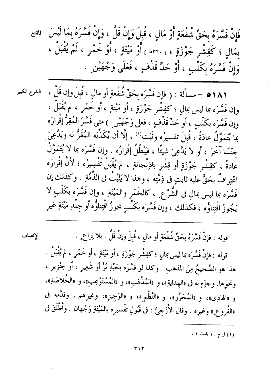 فَإنْ فَسَّرَهُ بِحَقِّ شُفْعَةٍ أَوْ مَالٍ، قُبلَ وَإِنْ قَلَّ، وَإِنْ فَسَّرَهُ بِمَا لَيْسَ بِمَالٍ؛ كَقِشْرِ جَوْزَةٍ، أَوْ مَيْتَةٍ، أَوْ خَمْرٍ، لَمْ يُقْبَلْ، وَإِنْ فَسَّرَهُ بِكَلْبٍ، أَوْ حَدِّ قَذْفٍ، فَعَلَى وَجْهَيْنِ.