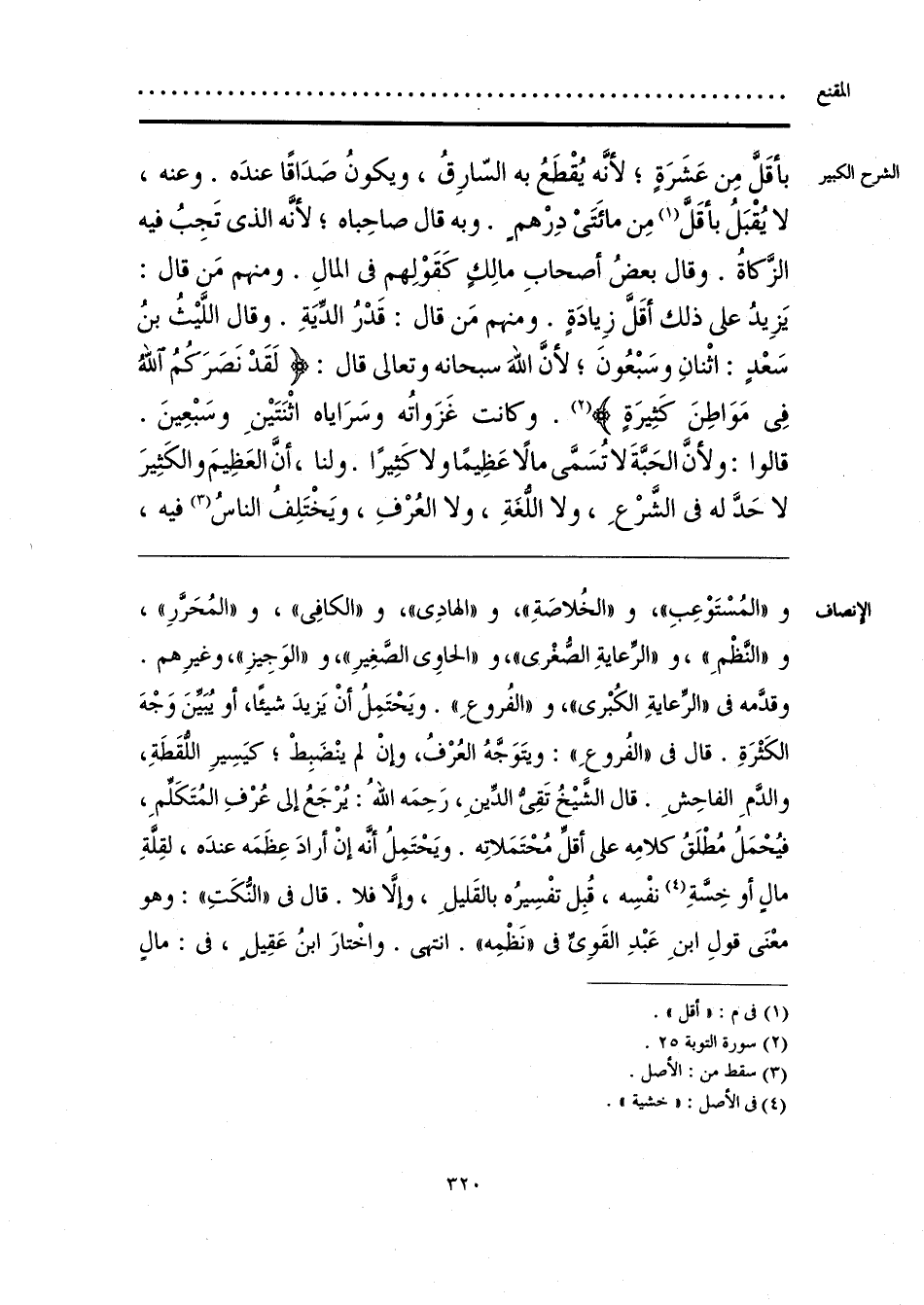 و «المُسْتَوْعِبِ»، و «الخُلاصَةِ»، و «الهادِى»، و «الكافِى»، و «المُحَرَّرِ»، و «النَّظْمِ»، و «الرِّعايَةِ الصُّغْرى»، و «الحاوِى الصَّغِيرِ»، و «الوَجِيزِ»، وغيرِهم. وقدَّمه فى «الرِّعَايَةِ الكُبْرى»، و «الفُروعِ». ويَحْتَمِلُ أَنْ يَزيدَ شيئًا، أو يُبَيِّنَ وَجْهَ الكَثْرَةِ. قال فى «الفُروعِ»: ويتَوَجَّهُ العُرْفُ، وإنْ لم ينْضَبِطْ؛ كيَسِيرِ اللُّقَطَةِ، والدَّمِ الفاحِشِ. قال الشَّيْخُ تَقِىُّ الدِّينِ، رَحِمَه اللَّهُ: يُرْجَعُ إلى عُرْفِ المُتَكَلِّمِ، فيُحْمَلُ مُطْلَقُ كلامِه على أقلِّ مُحْتَمَلاتِه. ويَحْتَمِلُ أنَّه إنْ أرادَ عِظَمَه عندَه، لقِلَّةِ مالٍ أو خِسَّةِ (¬1) نفْسِه، قُبِل تفْسِيرُه بالقَليلِ، وإلَّا فلا. قال فى «النُّكَتِ»: وهو معْنَى قولِ ابنِ عَبْدِ القَوِىِّ فى «نَظْمِه». انتهى. واخْتارَ ابنُ عَقِيلٍ، فى: مالٍ