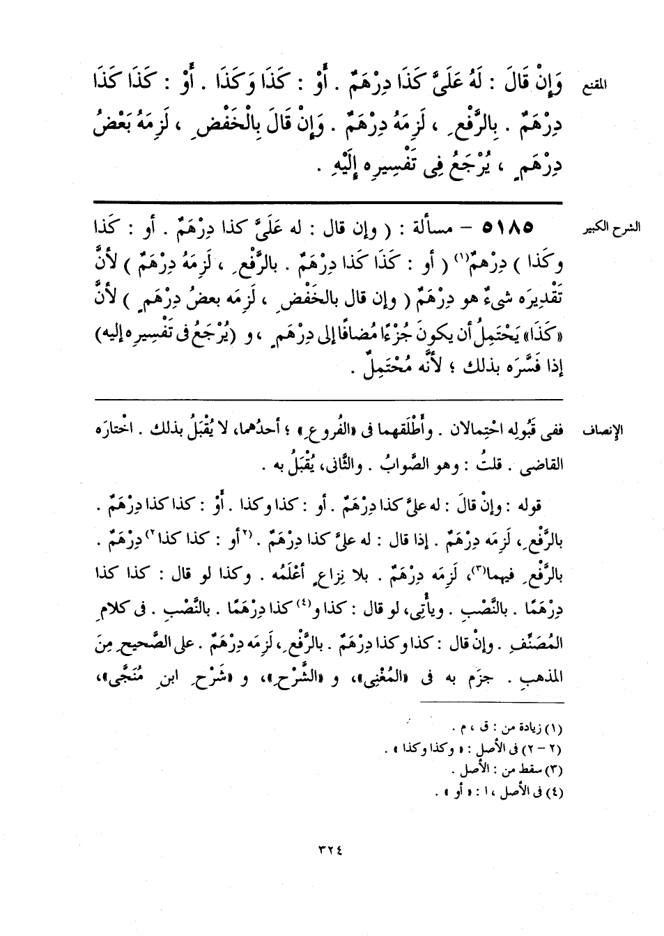 قوله: وإنْ قالَ: له علىَّ كذا دِرْهَمٌ. أو: كذا وكذا. أَوْ: كذا كذا دِرْهَمٌ. بالرَّفْعِ، لَزِمَه دِرْهَمٌ. إذا قال: له على كذا درْهَمٌ. [أو: كذا كذا] (¬1) درْهَمٌ. بالرَّفْعِ فيهما (¬2)، لَزِمَه دِرْهَمٌ. بلا نِزاعٍ أعلَمُه. وكذا لو قال: كذَا كذا دِرْهَمًا. بالنَّصْبِ. ويأْتِى، لو قال: كذا و (¬3) كذا دِرْهَمًا. بالنَّصْبِ. فى كلامِ المُصَنِّفِ. وإنْ قال: كذا وكذا دِرْهَمٌ. بالرفْعِ، لَزِمَه دِرْهَمٌ. على الصَّحيحِ مِنَ المذهبِ. جزَم به فى «المُغْنِى»، و «الشَّرْحِ»، و «شَرْحِ ابنِ مُنَجَّى»،
