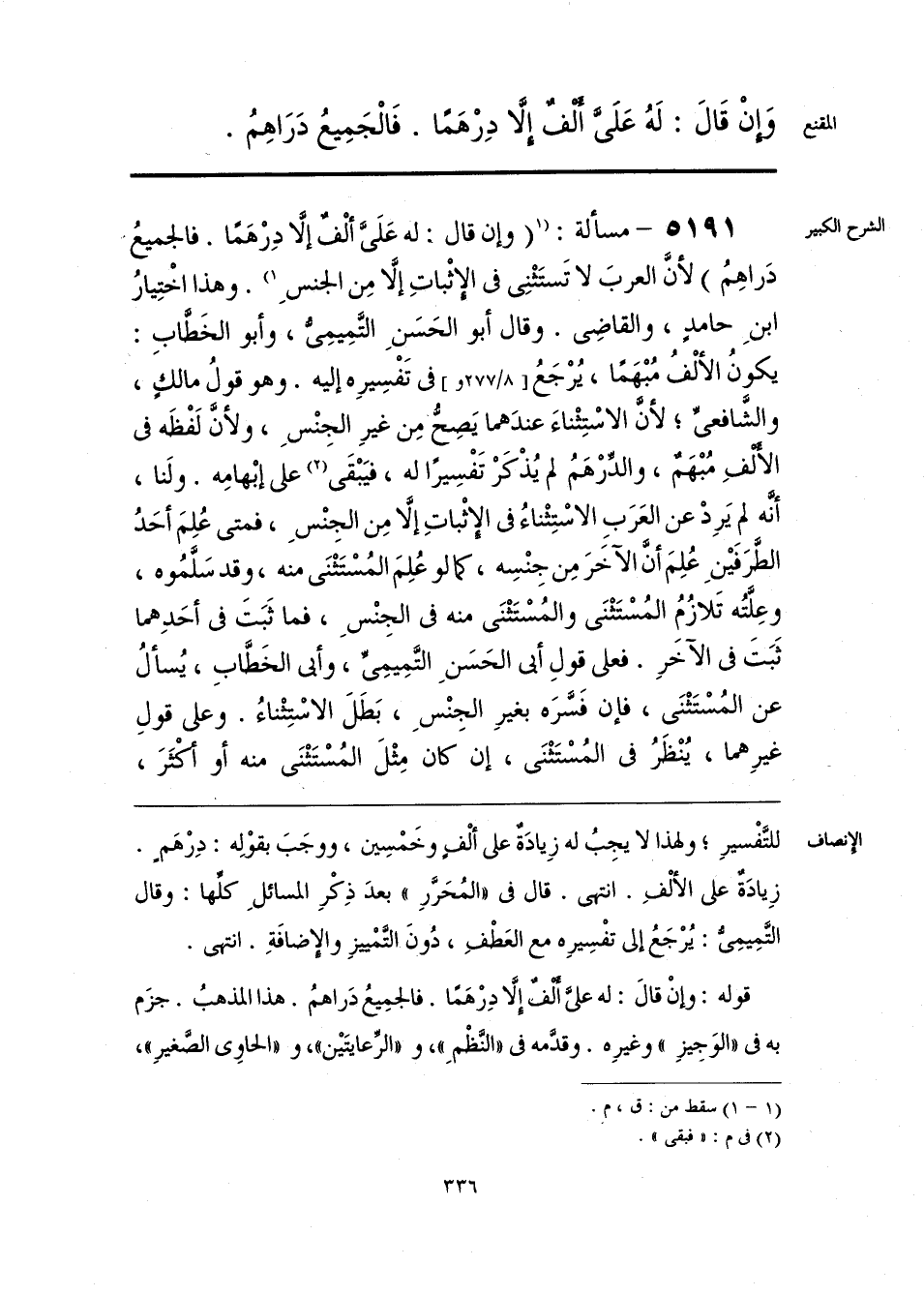 قوله: وإنْ قالَ: له علىَّ أَلْفٌ إلَّا دِرْهَمًا. فالجمِيعُ دَراهمُ. هذا المذهبُ. جزَم به فى «الوَجِيزِ» وغيرِه. وقدَّمه فى «النَّظْمِ»، و «الرِّعايتَيْن»، و «الحاوِى الصَّغيرِ»،