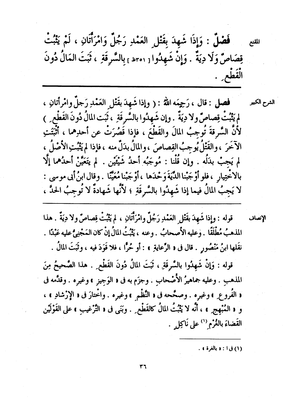 فصلٌ: وَإذَا شَهِدَ بِقَتْلِ العَمْدِ رَجُلٌ وَامْرَأتانِ، لَمْ يَثبُتْ قِصَاصٌ وَلَا دِيَةٌ. وَإنْ شَهِدُوا [351 ظ] بِالسرِقَةِ، ثبَتَ المَالُ دُونَ الْقَطْعَ.