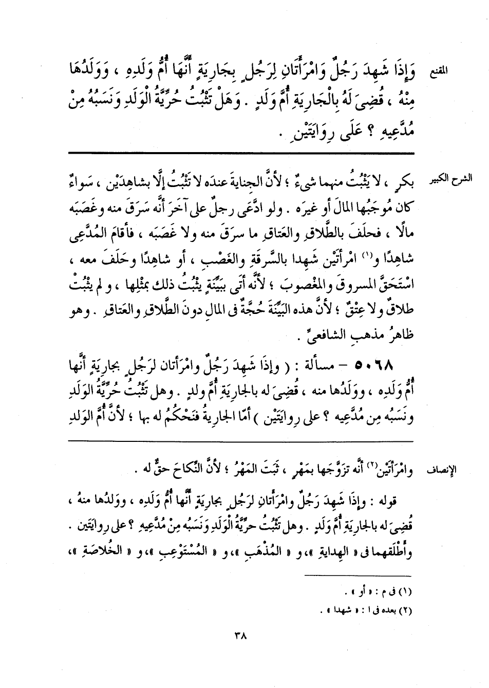 وَإذَا شَهِدَ رَجُلٌ وَامْرأتَانِ لِرَجُلٍ بِجَارِيَةٍ أنَهَا أُمُّ وَلَدِهِ، وَوَلَدُهَا مِنْهُ، قُضِىَ لَهُ بِالْجَارِيَةِ أُمُّ وَلَدٍ. وَهَلْ تَثْبتُ حُرِّيَّةُ الْوَلَدِ وَنَسَبُهُ مِنْ مُدَّعِيهِ؟ عَلَى رِوَايَتَيْنِ.