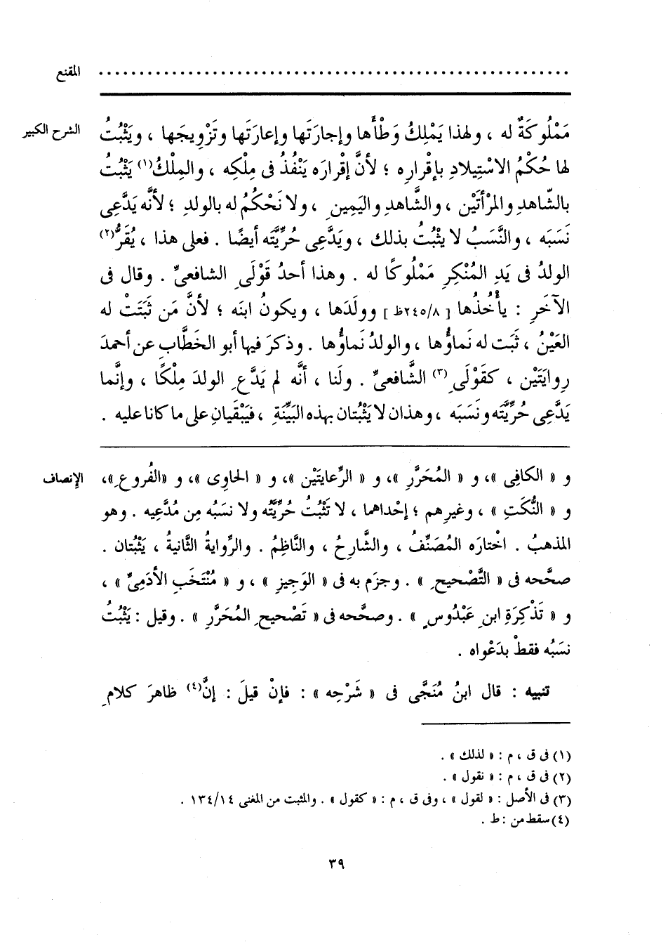 و «الكافِى»، و «المُحَرَّرِ»، و «الرِّعايتَيْن»، و «الحاوِى»، و «الفُروعِ»، و «النُّكَتِ»، وغيرِهم؛ إحْداهما، لا تَثْبُتُ حُرِّيته ولا نسَبُه مِن مُدَّعِيه. وهو المذهبُ. اخْتارَه المُصَنِّفُ، والشَّارِحُ، والنَاظِمُ. والرِّوايةُ الثَّانيةُ، يَثْبُتان. صحَّحه فى «التَّصْحيحِ». وجزَم به فى «الوَجِيزِ»، و «مُنْتَخَبِ الأدَمِىِّ»، و «تَذْكِرَةِ ابنِ عَبْدُوس». وصحَّحه فى «تَصْحيحِ المُحَرَّرِ». وقيل: يَثْبُتُ نسَبُه فقطْ بدَعْواه.