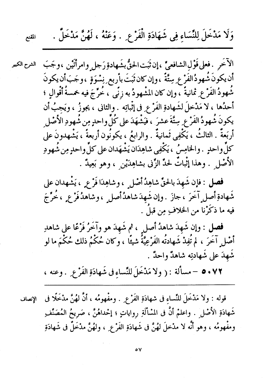 قوله: ولا مَدْخَلَ للنِّساءِ فى شهادَةِ الفَرْعِ. ومفْهومُه، أنَّ لهُنَّ مدْخَلًا فى شَهادَةِ الأصْلِ. واعلمْ أنَّ فى المسْألَةِ رِواياتٍ؛ إحْداهُنَّ، صرِيحُ المُصَنِّفِ ومفْهومُه، وهو أنَّه لا مدْخلَ لهُنَّ فى شَهادَةِ الفَرْعِ، ولهُنَّ مدْخَلٌ فى شَهادَةِ