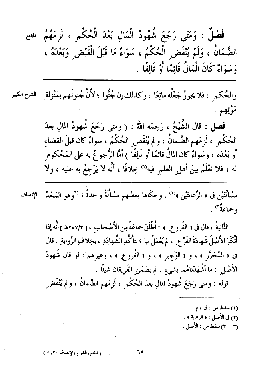 فَصْلٌ: وَمَتَى رَجَعَ شُهُودُ الْمَالِ بَعْدَ الْحُكْمِ، لَزِمَهُمُ الضمَانُ، وَلَمْ يُنْقَضِ الْحُكْمُ، سَوَاء مَا قَبْلَ الْقَبْضِ وَبَعْدَهُ، وَسَوَاءٌ كَانَ الْمَالُ قَائِمًا أوْ تَالِفًا.