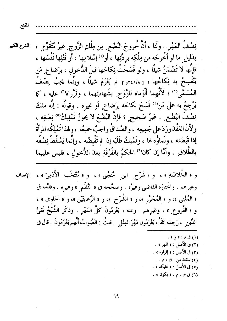 و «الخُلاصَةِ»، و «شَرْحِ ابنِ مُنَجَّى»، و «مُنْتَخَبِ الأدَمِىِّ»، وغيرِهم. واخْتارَه القاضى وغيرُه. وصحَّحه فى «النَّظْمِ» وغيرِه. وقدَّمه فى «المُغْنِى»، و «المُحَرَّرِ»، و «الشَّرْحِ»، و «الرِّعايتَيْن»، و «الحاوِى»، و «الفُروعِ»، وغيرِهم. وعنه، يَغْرَمُونَ كلَّ المَهْرِ. وذكَر الشَّيْخُ تَقِىُّ الدِّينِ، رَحِمَه اللهُ، يَغْرَمُون مَهْرَ المِثْلِ. قلتُ: الصَّوابُ أنَّهم يَغْرَمُونَ. قال فى