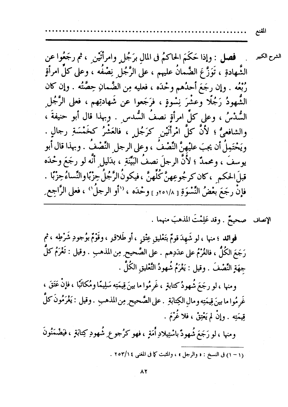 فوائد؛ منها، لو شَهِدَ قومٌ بتَعْليقِ عِتْقٍ، أو طَلاقٍ، وقَوْمٌ بوُجودِ شَرْطِه، ثم رَجَعَ الكُلُّ، فالغُرْمُ على عدَدِهم. على الصَّحيحِ مِن المذهبِ. وقيل: تَغْرَمُ كلُّ جِهَةٍ النِّصْفَ. وقيل: يَغْرَمُ شُهودُ التَّعْليقِ الكُلَّ.