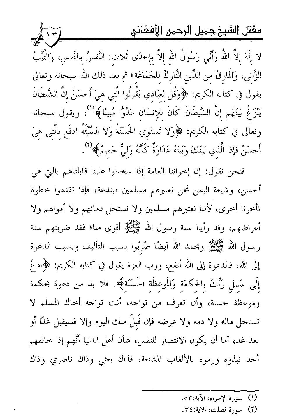 لا إله إلاّ الله وأنّي رسول الله إلاّ بإحدى ثلاث: النّفس بالنّفس، والثّيّب الزّاني، والمارق من الدّين التّارك للجماعة)) ثم بعد ذلك الله سبحانه وتعالى يقول في كتابه الكريم: {وقل لعبادي يقولوا الّتي هي أحسن إنّ الشّيطان ينْزغ بينهم إنّ الشّيطان كان للإنسان عدوًّا مبينًا (¬1)}، ويقول سبحانه وتعالى في كتابه الكريم: {ولا تستوي الحسنة ولا السّيّئة ادفع بالّتي هي أحسن فإذا الّذي بينك وبينه عداوة كأنّه وليّ حميم (¬2)}.