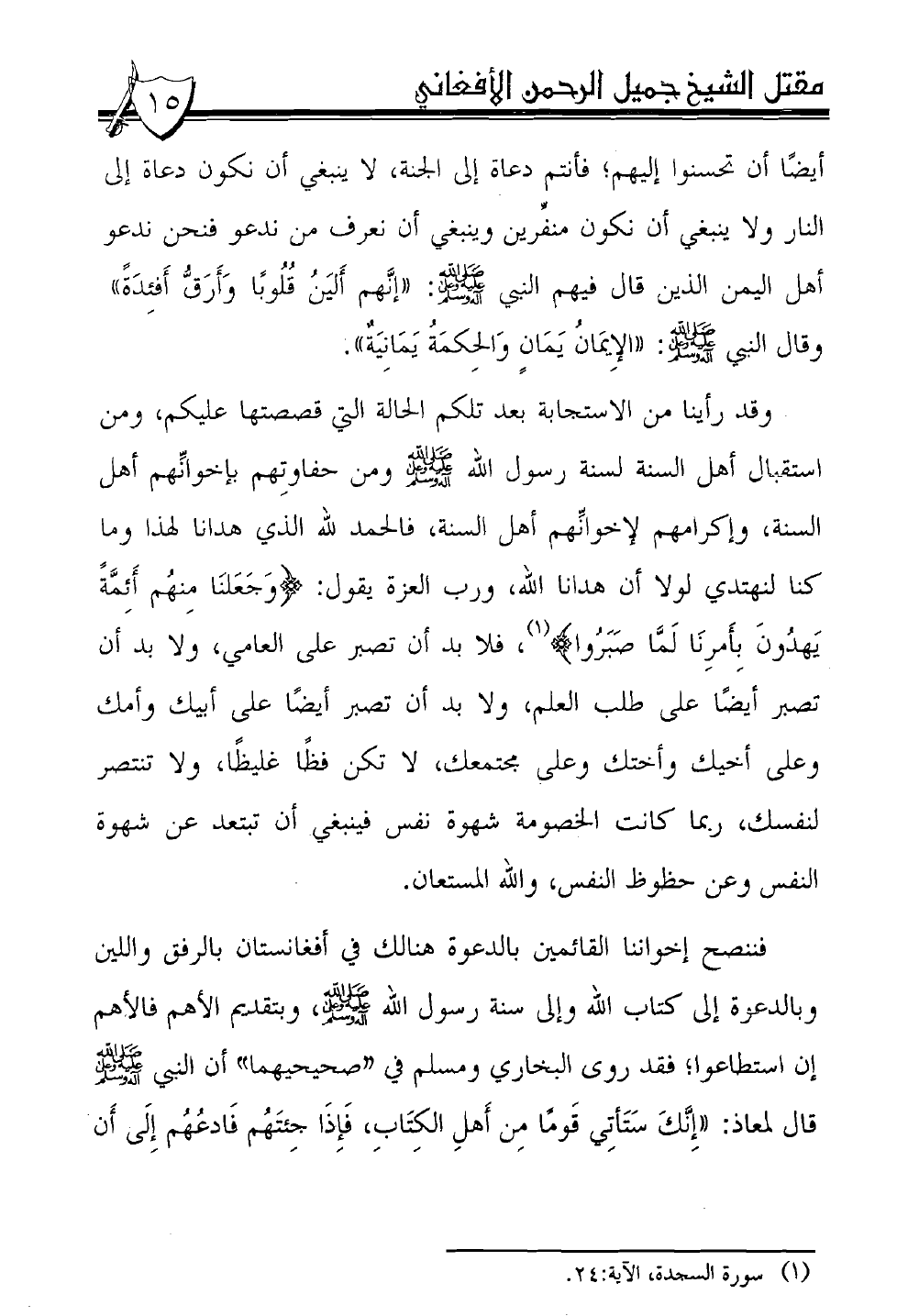 فننصح إخواننا القائمين بالدعوة هنالك في أفغانستان بالرفق واللين وبالدعوة إلى كتاب الله وإلى سنة رسول الله صلى الله عليه وعلى آله وسلم، وبتقديم الأهم فالأهم إن استطاعوا؛ فقد روى البخاري ومسلم في "صحيحيهما" أن النبي صلى الله عليه وعلى آله وسلم قال لمعاذ: ((إنّك ستأتي قومًا من أهل الكتاب، فإذا جئتهم فادعهم إلى أن