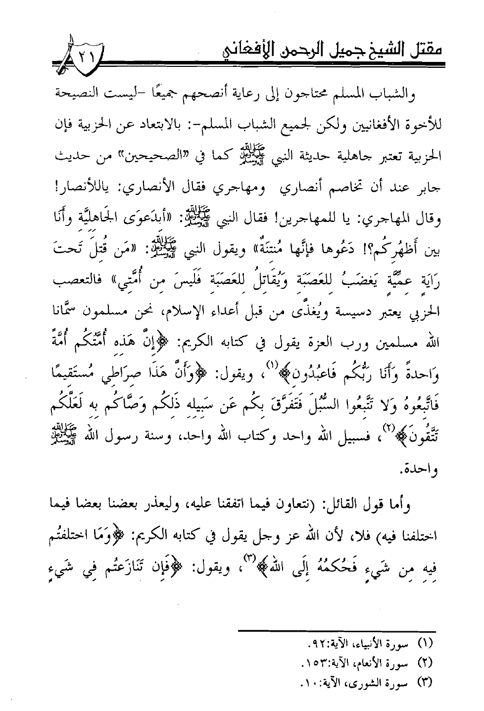 والشباب المسلم محتاجون إلى رعاية أنصحهم جميعًا -ليست النصيحة للأخوة الأفغانيين ولكن لجميع الشباب المسلم-: بالابتعاد عن الحزبية فإن الحزبية تعتبر جاهلية حديثة النبي صلى الله عليه وعلى آله وسلم كما في "الصحيحين" من حديث جابر عند أن تخاصم أنصاري ومهاجري فقال الأنصاري: ياللأنصار! وقال المهاجري: يا للمهاجرين! فقال النبي صلى الله عليه وعلى آله وسلم: ((أبدعوى الجاهليّة وأنا بين أظهركم؟! دعوها فإنّها منتنة)) ويقول النبي صلى الله عليه وعلى آله وسلم: ((من قتل تحت راية عمّيّة يغضب للعصبة ويقاتل للعصبة فليس من أمّتي)) فالتعصب الحزبي يعتبر دسيسة ويغذّى من قبل أعداء الإسلام، نحن مسلمون سمّانا الله مسلمين ورب العزة يقول في كتابه الكريم: {إنّ هذه أمّتكم أمّةً واحدةً وأنا ربّكم فاعبدون (¬1)}، ويقول: {وأنّ هذا صراطي مستقيمًا فاتّبعوه ولا تتّبعوا السّبل فتفرّق بكم عن سبيله ذلكم وصّاكم به لعلّكم تتّقون (¬2)}، فسبيل الله واحد وكتاب الله واحد، وسنة رسول الله صلى الله عليه وعلى آله وسلم واحدة.