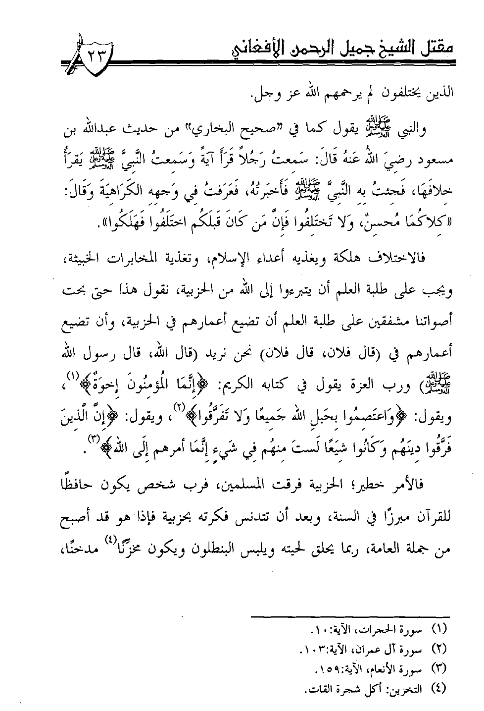 فالاختلاف هلكة ويغذيه أعداء الإسلام، وتغذية المخابرات الخبيثة، ويجب على طلبة العلم أن يتبرءوا إلى الله من الحزبية، نقول هذا حتى بحت أصواتنا مشفقين على طلبة العلم أن تضيع أعمارهم في الحزبية، وأن تضيع أعمارهم في (قال فلان، قال فلان) نحن نريد (قال الله، قال رسول الله صلى الله عليه وعلى آله وسلم) ورب العزة يقول في كتابه الكريم: {إنّما المؤمنون إخوة (¬1)}، ويقول: {واعتصموا بحبل الله جميعًا ولا تفرّقوا (¬2)}، ويقول: {إنّ الّذين فرّقوا دينهم وكانوا شيعًا لست منهم في شيء إنّما أمرهم إلى الله (¬3)}.