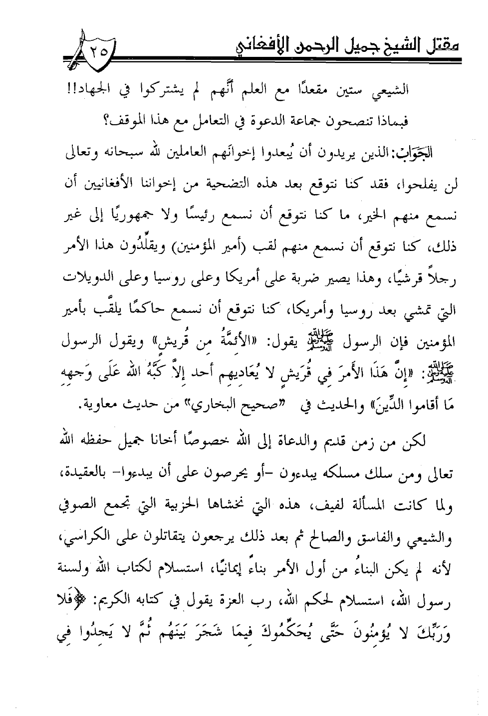 الجواب: الذين يريدون أن يبعدوا إخوانهم العاملين لله سبحانه وتعالى لن يفلحوا، فقد كنا نتوقع بعد هذه التضحية من إخواننا الأفغانيين أن نسمع منهم الخير، ما كنا نتوقع أن نسمع رئيسًا ولا جمهوريًا إلى غير ذلك، كنا نتوقع أن نسمع منهم لقب (أمير المؤمنين) ويقلّدون هذا الأمر رجلاً قرشيًا، وهذا يصير ضربة على أمريكا وعلى روسيا وعلى الدويلات التي تمشي بعد روسيا وأمريكا، كنا نتوقع أن نسمع حاكمًا يلقّب بأمير المؤمنين فإن الرسول صلى الله عليه وعلى آله وسلم يقول: ((الأئمّة من قريش)) ويقول الرسول صلى الله عليه وعلى آله وسلم: ((إنّ هذا الأمر في قريش لا يعاديهم أحد إلاّ كبّه الله على وجهه ما أقاموا الدّين)) والحديث في "صحيح البخاري" من حديث معاوية.