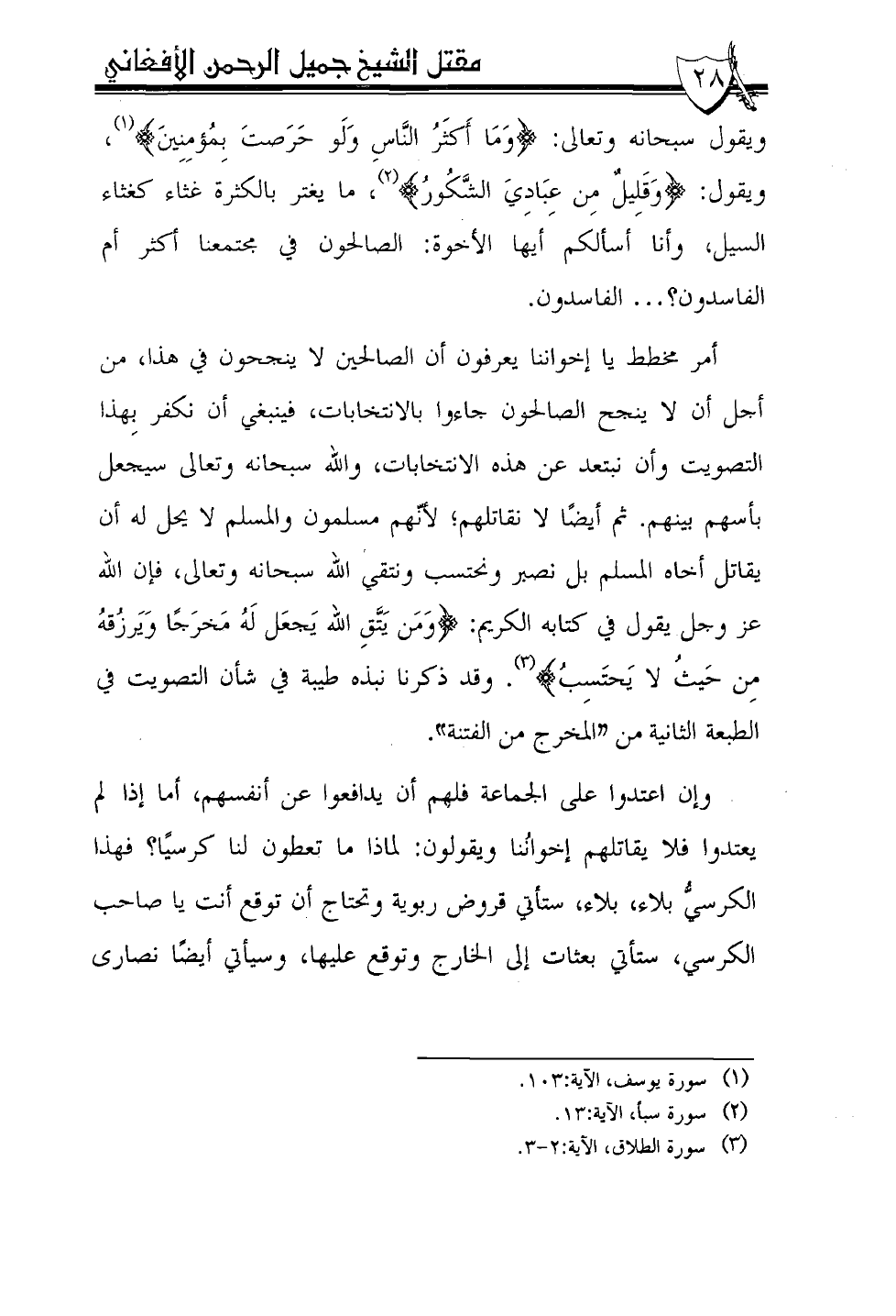 أمر مخطط يا إخواننا يعرفون أن الصالحين لا ينجحون في هذا، من أجل أن لا ينجح الصالحون جاءوا بالانتخابات، فينبغي أن نكفر بهذا التصويت وأن نبتعد عن هذه الانتخابات، والله سبحانه وتعالى سيجعل بأسهم بينهم. ثم أيضًا لا نقاتلهم؛ لأنّهم مسلمون والمسلم لا يحل له أن يقاتل أخاه المسلم بل نصبر ونحتسب ونتقي الله سبحانه وتعالى، فإن الله عز وجل يقول في كتابه الكريم: {ومن يتّق الله يجعل له مخرجًا ويرزقه من حيث لا يحتسب (¬3)}. وقد ذكرنا نبذه طيبة في شأن التصويت في الطبعة الثانية من "المخرج من الفتنة".
