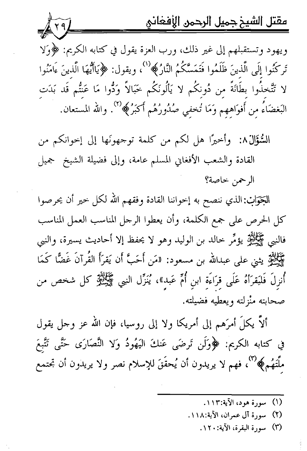 السؤال8: وأخيرًا هل لكم من كلمة توجهونها إلى إخوانكم من القادة والشعب الأفغاني المسلم عامة، وإلى فضيلة الشيخ جميل الرحمن خاصة؟