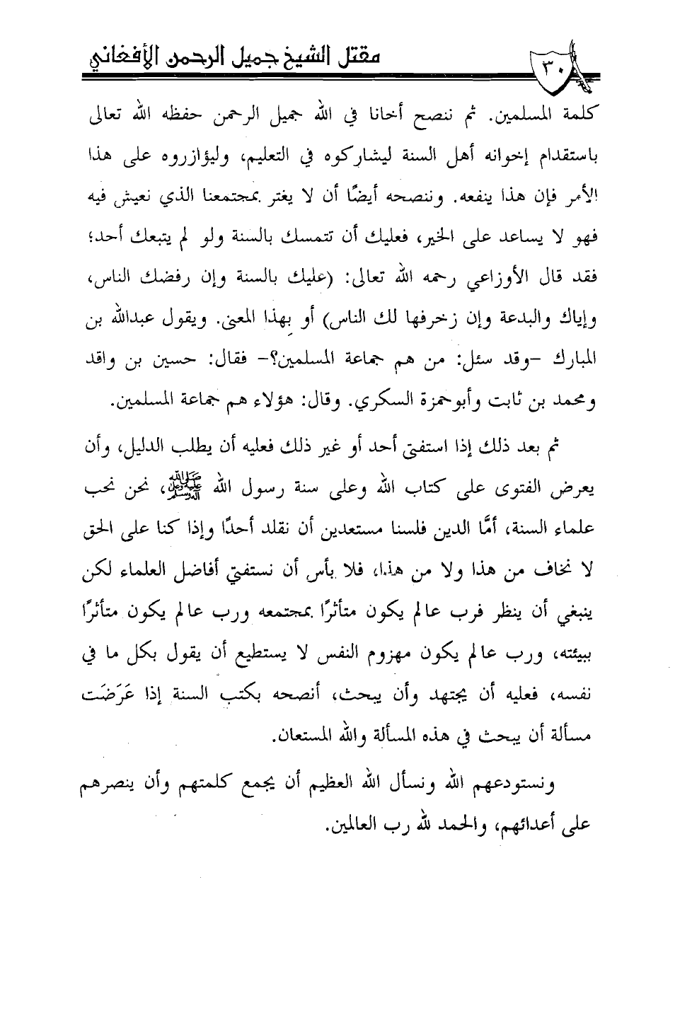 كلمة المسلمين. ثم ننصح أخانا في الله جميل الرحمن حفظه الله تعالى باستقدام إخوانه أهل السنة ليشاركوه في التعليم، وليؤازروه على هذا الأمر فإن هذا ينفعه. وننصحه أيضًا أن لا يغتر بمجتمعنا الذي نعيش فيه فهو لا يساعد على الخير، فعليك أن تتمسك بالسنة ولو لم يتبعك أحد؛ فقد قال الأوزاعي رحمه الله تعالى: (عليك بالسنة وإن رفضك الناس، وإياك والبدعة وإن زخرفها لك الناس) أو بهذا المعنى. ويقول عبد الله بن المبارك -وقد سئل: من هم جماعة المسلمين؟ - فقال: حسين بن واقد ومحمد بن ثابت وأبوحمزة السكري. وقال: هؤلاء هم جماعة المسلمين.