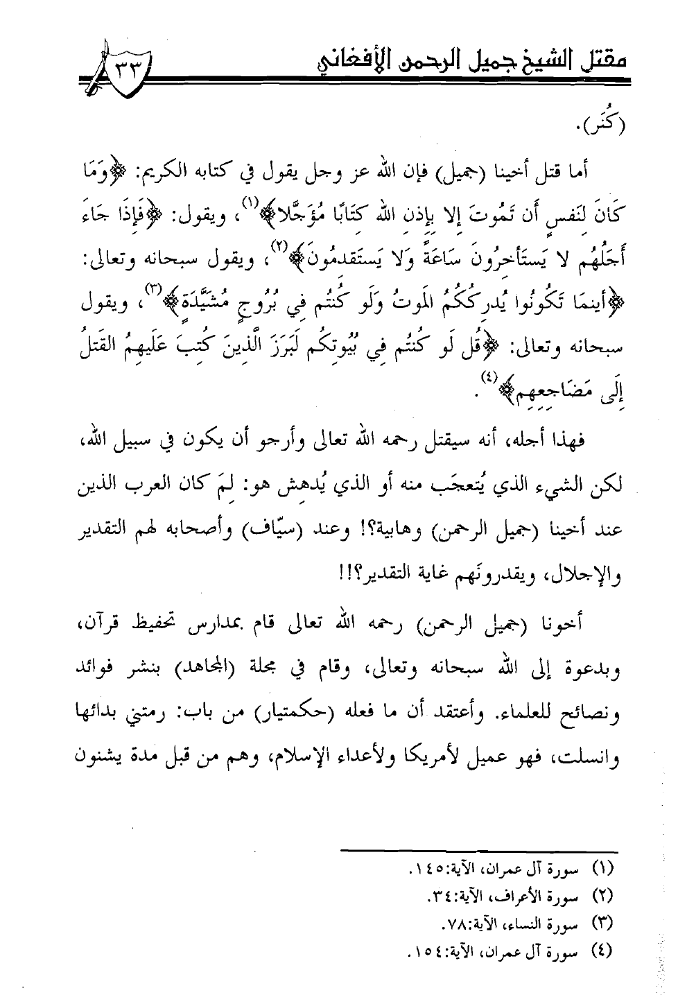 أما قتل أخينا (جميل) فإن الله عز وجل يقول في كتابه الكريم: {وما كان لنفس أن تموت إلا بإذن الله كتابًا مؤجّلا (¬1)}، ويقول: {فإذا جاء أجلهم لا يستأخرون ساعةً ولا يستقدمون (¬2)}، ويقول سبحانه وتعالى: {أينما تكونوا يدرككم الموت ولو كنتم في بروج مشيّدة (¬3)}، ويقول سبحانه وتعالى: {قل لو كنتم في بيوتكم لبرز الّذين كتب عليهم القتل إلى مضاجعهم (¬4)}.