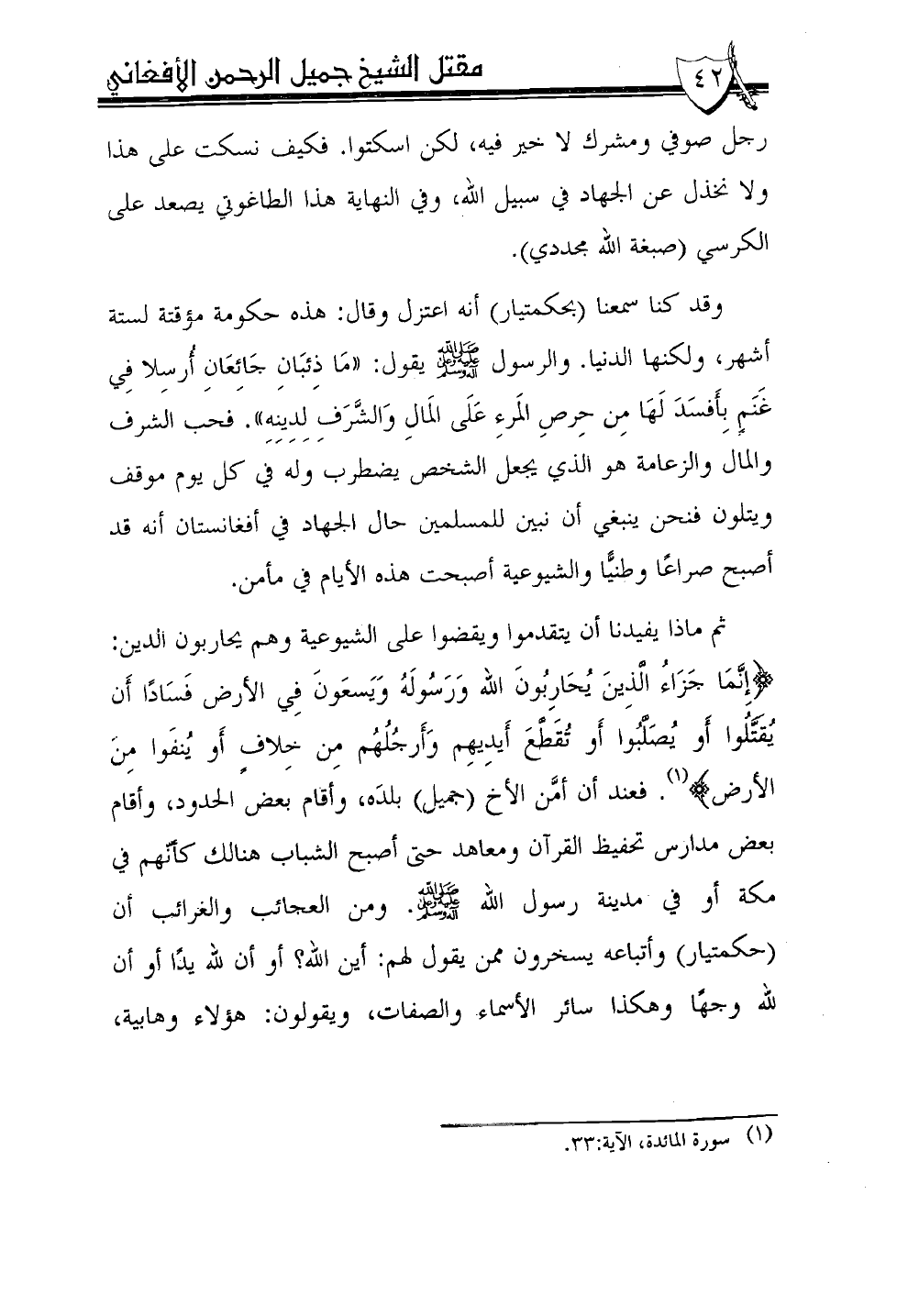 ثم ماذا يفيدنا أن يتقدموا ويقضوا على الشيوعية وهم يحاربون الدين: {إنّما جزاء الّذين يحاربون الله ورسوله ويسعون في الأرض فسادًا أن يقتّلوا أو يصلّبوا أو تقطّع أيديهم وأرجلهم من خلاف أو ينفوا من الأرض (¬1)}. فعند أن أمّن الأخ (جميل) بلده، وأقام بعض الحدود، وأقام بعض مدارس تحفيظ القرآن ومعاهد حتى أصبح الشباب هنالك كأنّهم في مكة أو في مدينة رسول الله صلى الله عليه وعلى آله وسلم. ومن العجائب والغرائب أن (حكمتيار) وأتباعه يسخرون ممن يقول لهم: أين الله؟ أو أن لله يدًا أو أن لله وجهًا وهكذا سائر الأسماء والصفات، ويقولون: هؤلاء وهابية،