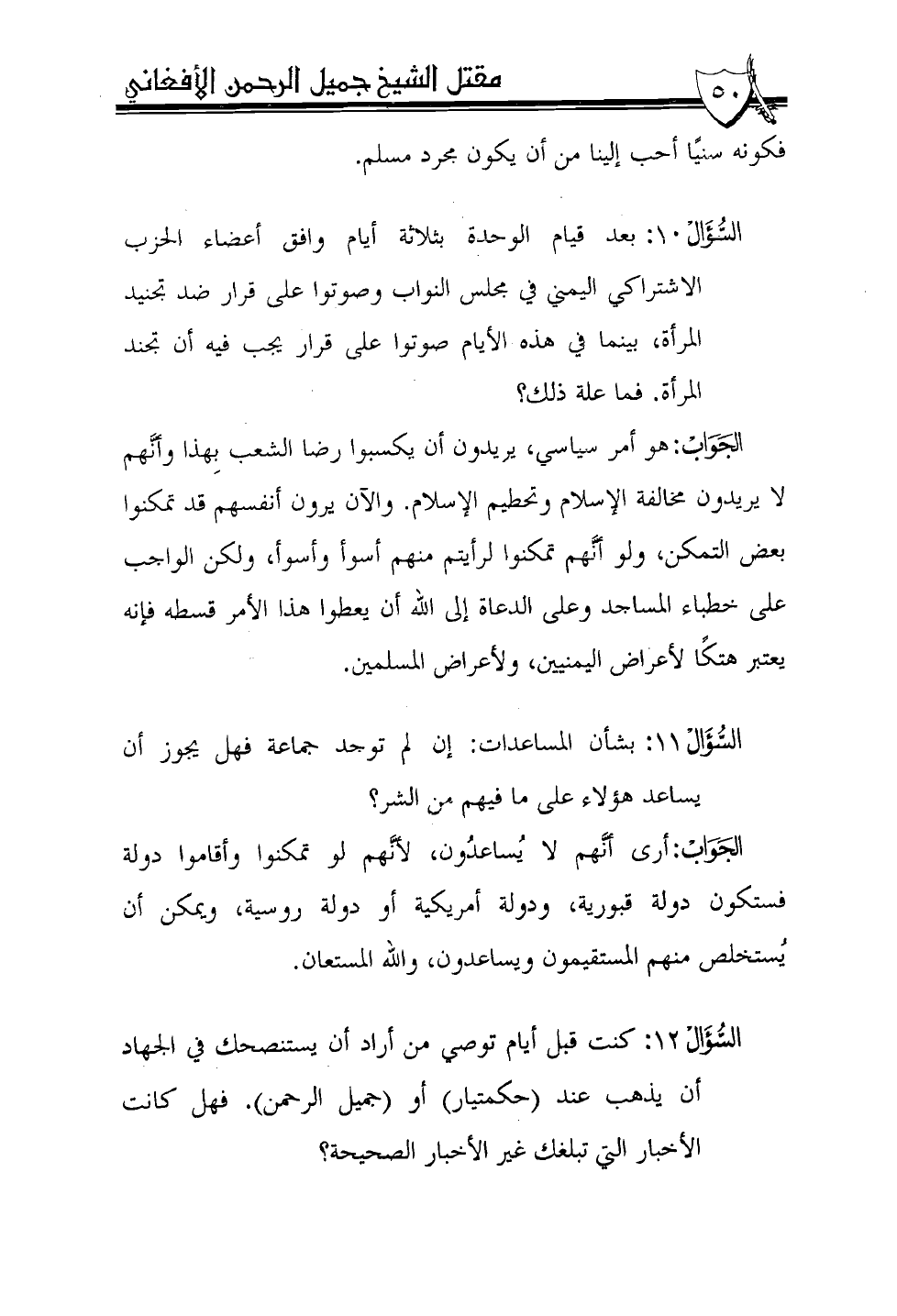 السؤال20: كنت قبل أيام توصي من أراد أن يستنصحك في الجهاد أن يذهب عند (حكمتيار) أو (جميل الرحمن). فهل كانت الأخبار التي تبلغك غير الأخبار الصحيحة؟