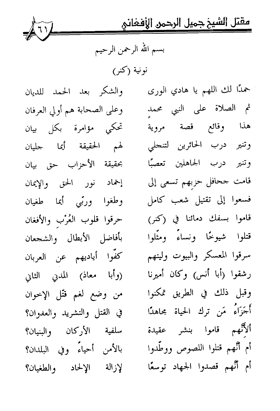 حمدًا لك اللهم يا هادي الورىثم الصلاة على النبي محمدهذا وقائع قصة مرويةوتنير درب الحائرين لتنجليوتنير درب الجاهلين تعصبًاقامت جحافل حزبهم تسعى إلىفسعوا إلى تقتيل شعب كاملقاموا بسفك دمائنا في (كنر) قتلوا شيوخًا ونساءً ومثّلواسرقوا المعسكر والبيوت وليتهمرشقوا (أبا أنس) وكان أميرناوقبل ذلك في الطريق تمكنواأجزاء من ترك الحياة مجاهدًاألأنّهم قاموا بنشر عقيدة أم أنّهم قتلوا اللصوص ووطّدوا أم أنّهم قصدوا الجهاد توسعًا