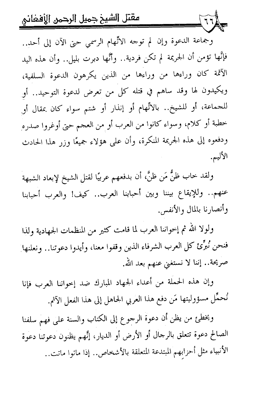 وجماعة الدعوة وإن لم توجه الاتّهام الرسمي حتى الآن إلى أحد .. فإنّها تؤمن أن الجريمة لم تكن فردية .. وأنّها دبرت بليل .. وأن هذه اليد الآثمة كان وراءها من وراءها من الذين يكرهون الدعوة السلفية، ويكيدون لها وقد ساهم في قتله كل من تعرض لدعوة التوحيد .. أو للجماعة، أو للشيخ .. بالاتّهام أو إنذار أو شتم سواء كان بمقال أو خطبة أو كلام، وسواء كانوا من العرب أو من العجم حتى أوغروا صدره ودفعوه إلى هذه الجريمة المنكرة، وأن على هؤلاء جميعًا وزر هذا الحادث الأليم.