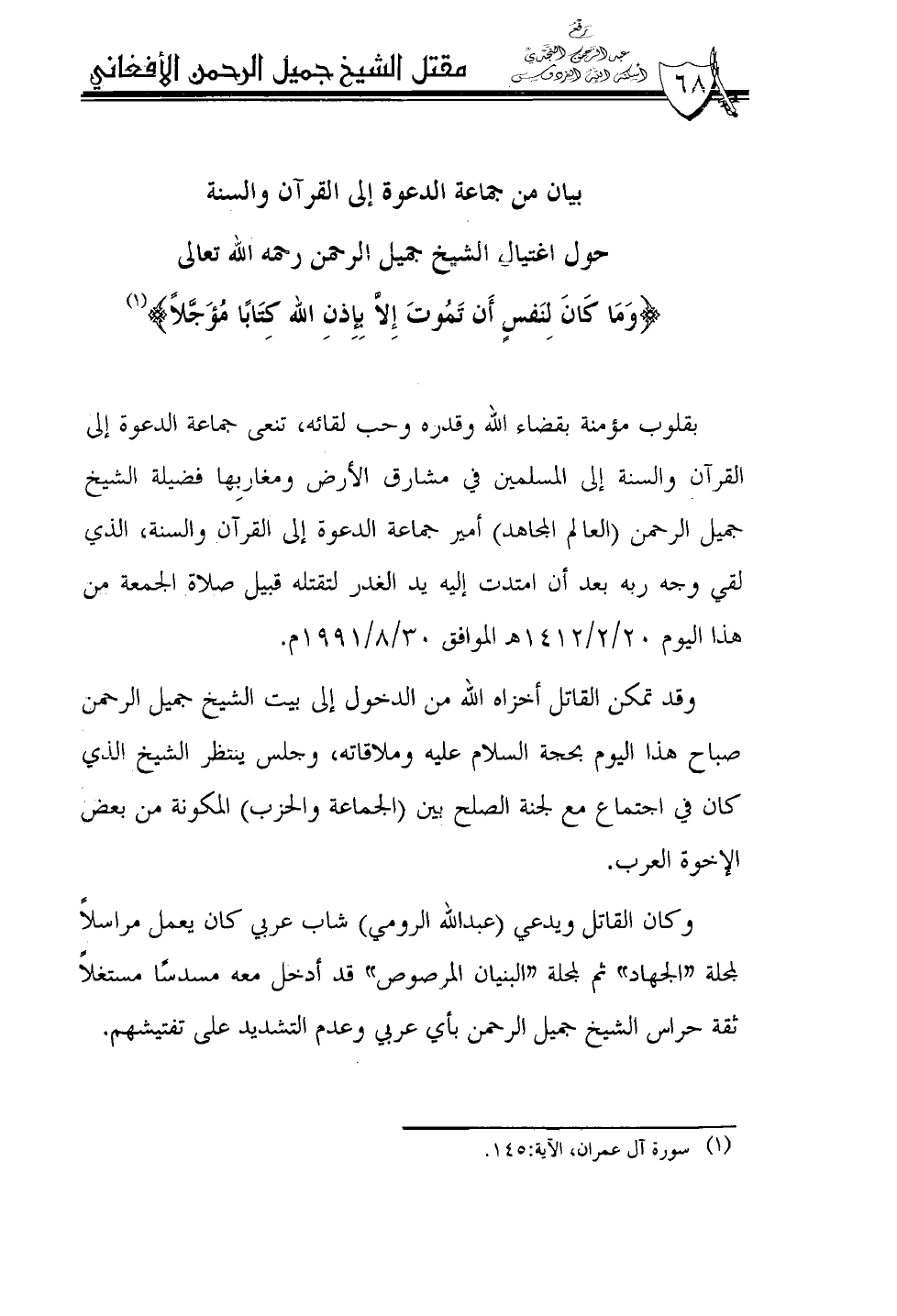 بقلوب مؤمنة بقضاء الله وقدره وحب لقائه، تنعى جماعة الدعوة إلى القرآن والسنة إلى المسلمين في مشارق الأرض ومغاربها فضيلة الشيخ جميل الرحمن (العالم المجاهد) أمير جماعة الدعوة إلى القرآن والسنة، الذي لقي وجه ربه بعد أن امتدت إليه يد الغدر لتقتله قبيل صلاة الجمعة من هذا اليوم 20/ 2/1412 الموافق 30/ 8/1991م.