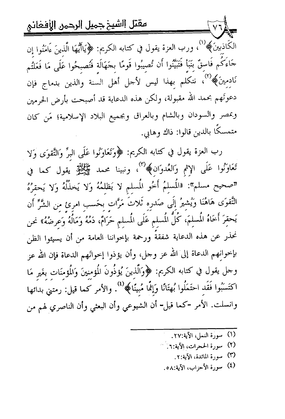 رب العزة يقول في كتابه الكريم: {وتعاونوا على البرّ والتّقوى ولا تعاونوا على الإثم والعدوان (¬3)}، ونبينا محمد صلى الله عليه وعلى آله وسلم يقول كما في "صحيح مسلم": ((المسلم أخو المسلم لا يظلمه ولا يخذله ولا يحقره التّقوى هاهنا ويشير إلى صدره ثلاث مرّات بحسب امرئ من الشّرّ أن يحقر أخاه المسلم، كلّ المسلم على المسلم حرام، دمه وماله وعرضه)) نحن نحذر عن هذه الدعاية شفقةً ورحمة بإخواننا العامة من أن يسيئوا الظن بإخوانّهم الدعاة إلى الله عز وجل، وأن يؤذوا إخوانهم الدعاة فإن الله عز وجل يقول في كتابه الكريم: {والّذين يؤذون المؤمنين والمؤمنات بغير ما اكتسبوا فقد احتملوا بهتانًا وإثمًا مبينًا (¬4)}. والأمر كما قيل: رمتني بدائها وانسلت. الأمر كما قيل أن الشيوعي وأن البعثي وأن الناصري لهم من
