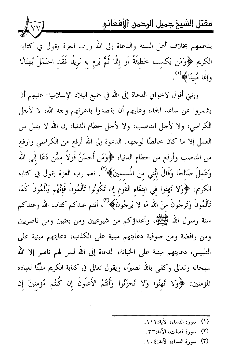 وإنني أقول لإخواني الدعاة إلى الله في جميع البلاد الإسلامية: عليهم أن يشمروا عن ساعد الجد، وعليهم أن يقصدوا بدعوتهم وجه الله، لا لأجل الكراسي، ولا لأجل المناصب، ولا لأجل حطام الدنيا، إن الله لا يقبل من العمل إلا ما كان خالصًا لوجهه. الدعوة إلى الله أرفع من الكراسي وأرفع من المناصب وأرفع من حطام الدنيا، {ومن أحسن قولاً ممّن دعا إلى الله وعمل صالحًا وقال إنّني من المسلمين (¬2)}. نعم رب العزة يقول في كتابه الكريم: {ولا تهنوا في ابتغاء القوم إن تكونوا تألمون فإنّهم يألمون كما تألمون وترجون من الله ما لا يرجون (¬3)}، أنتم عندكم كتاب الله وعندكم سنة رسول الله صلى الله عليه وعلى آله وسلم، وأعداؤكم من شيوعيين ومن بعثيين ومن ناصريين ومن رافضة ومن صوفية دعايتهم مبنية على الكذب، دعايتهم مبنية على التلبيس، دعايتهم مبنية على الخيانة، الدعاة إلى الله ليس لهم ناصر إلا الله سبحانه وتعالى وكفى بالله نصيرًا، ويقول تعالى في كتابة الكريم مثبّتًا لعباده المؤمنين: {ولا تهنوا ولا تحزنوا وأنتم الأعلون إن كنتم مؤمنين إن