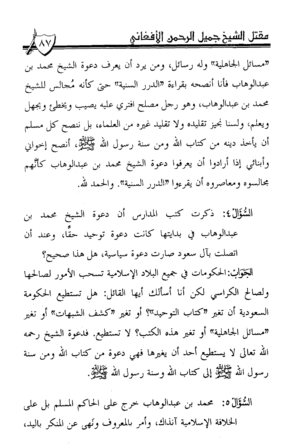 "مسائل الجاهلية" وله رسائل، ومن يريد أن يعرف دعوة الشيخ محمد ابن عبد الوهاب فأنا أنصحه بقراءة "الدرر السنية" حتى كأنه مجالس للشيخ محمد بن عبد الوهاب، وهو رجل مصلح افتري عليه يصيب ويخطئ ويجهل ويعلم، ولسنا نجيز تقليده ولا تقليد غيره من العلماء، بل ننصح كل مسلم أن يأخذ دينه من كتاب الله ومن سنة رسول الله صلى الله عليه وعلى آله وسلم، أنصح إخواني وأبنائي إذا أرادوا أن يعرفوا دعوة الشيخ محمد بن عبد الوهاب كأنّهم مجالسوه ومعاصروه أنصحهم أن يقرءوا "الدرر السنية". والحمد لله.