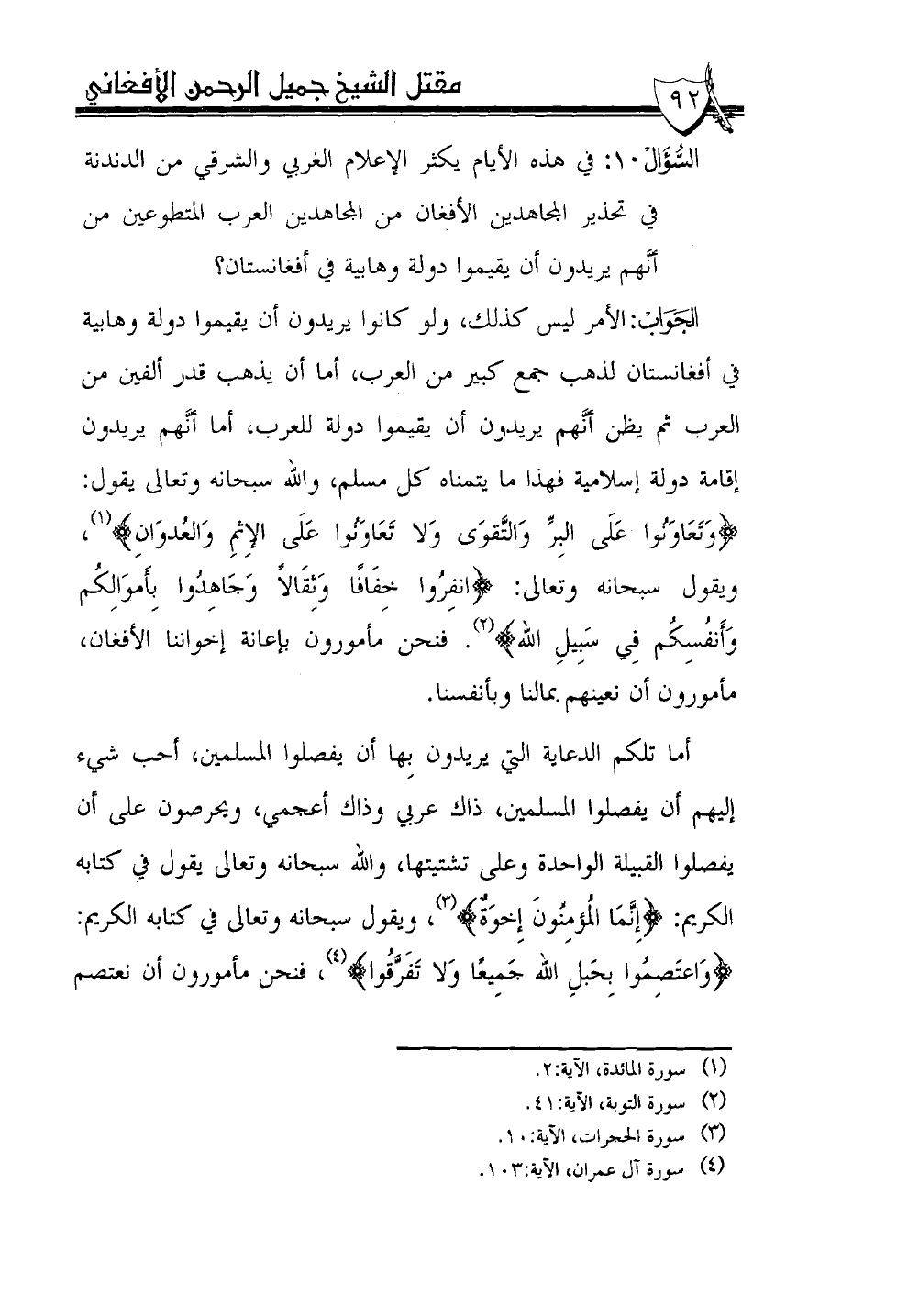 الجواب: الأمر ليس كذلك، ولو كانوا يريدون أن يقيموا دولة وهابية في أفغانستان لذهب جمع كبير من العرب، أما أن يذهب قدر ألفين من العرب ثم يظن أنّهم يريدون أن يقيموا دولة للعرب، أما أنّهم يريدون إقامة دولة إسلامية فهذا ما يتمناه كل مسلم، والله سبحانه وتعالى يقول: {وتعاونوا على البرّ والتّقوى ولا تعاونوا على الإثم والعدوان (¬1)}، ويقول سبحانه وتعالى: {انفروا خفافًا وثقالاً وجاهدوا بأموالكم وأنفسكم في سبيل الله (¬2)}. فنحن مأمورون بإعانة إخواننا الأفغان، مأمورون أن نعينهم بمالنا وبأنفسنا.