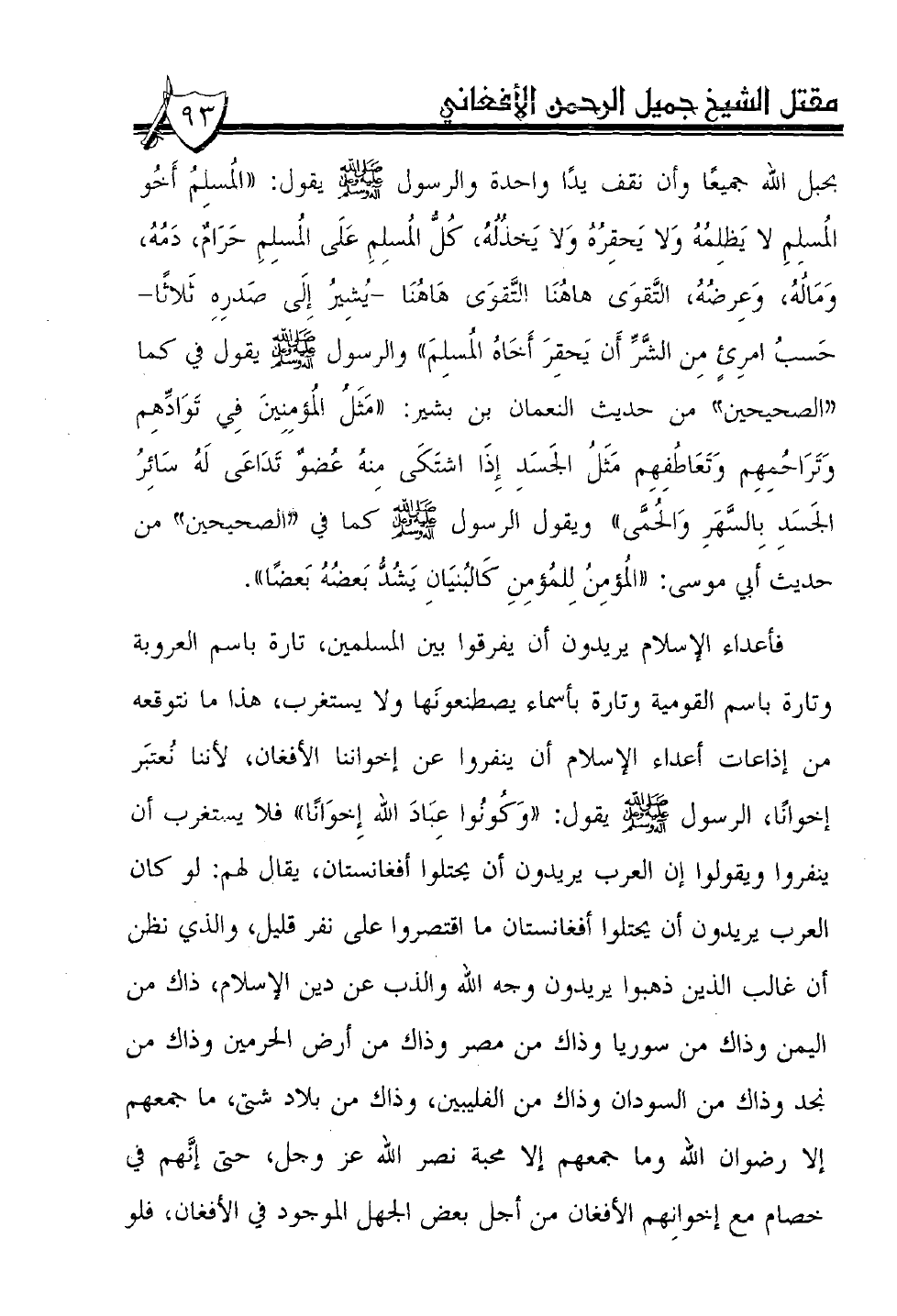 فأعداء الإسلام يريدون أن يفرقوا بين المسلمين، تارة باسم العروبة وتارة باسم القومية وتارة بأسماء يصطنعونها ولا يستغرب، هذا ما نتوقعه من إذاعات أعداء الإسلام أن ينفروا عن إخواننا الأفغان، لأننا نعتبر إخوانًا، الرسول صلى الله عليه وعلى آله وسلم يقول: ((وكونوا عباد الله إخوانًا)) فلا يستغرب أن ينفروا ويقولوا إن العرب يريدون أن يحتلوا أفغانستان، يقال لهم: لو كان العرب يريدون أن يحتلوا أفغانستان ما اقتصروا على نفر قليل، والذي نظن أن غالب الذين ذهبوا يريدون وجه الله والذب عن دين الإسلام، ذاك من اليمن وذاك من سوريا وذاك من مصر وذاك من أرض الحرمين وذاك من نجد وذاك من السودان وذاك من الفليبين، وذاك من بلاد شتى، ما جمعهم إلا رضوان الله وما جمعهم إلا محبة نصر الله عز وجل، حتى إنّهم في خصام مع إخوانهم الأفغان من أجل بعض الجهل الموجود في الأفغان، فلو