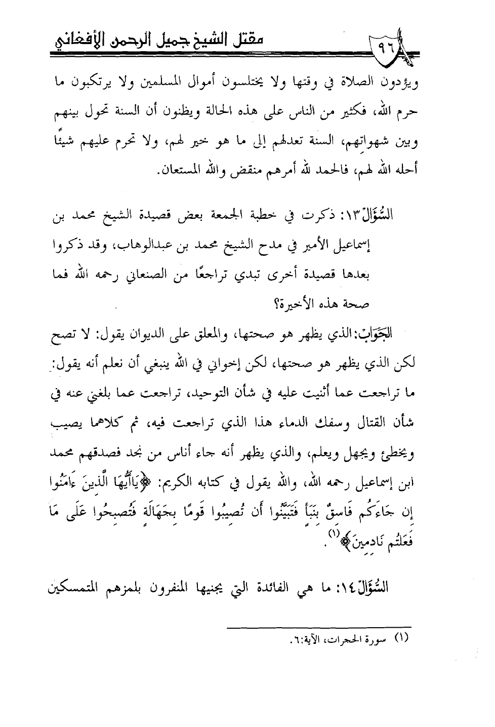 الجواب: الذي يظهر هو صحتها، والمعلق على الديوان يقول: لا تصح لكن الذي يظهر هو صحتها، لكن إخواني في الله ينبغي أن نعلم أنه يقول: ما تراجعت عما أثنيت عليه في شأن التوحيد، تراجعت عما بلغني عنه في شأن القتال وسفك الدماء هذا الذي تراجعت فيه، ثم كلاهما يصيب ويخطئ ويجهل ويعلم، والذي يظهر أنه جاء أناس من نجد فصدقهم محمد بن إسماعيل رحمه الله، والله يقول في كتابه الكريم: {ياأيّها الّذين ءامنوا إن جاءكم فاسق بنبأ فتبيّنوا أن تصيبوا قومًا بجهالة فتصبحوا على ما فعلتم نادمين (¬1)}.