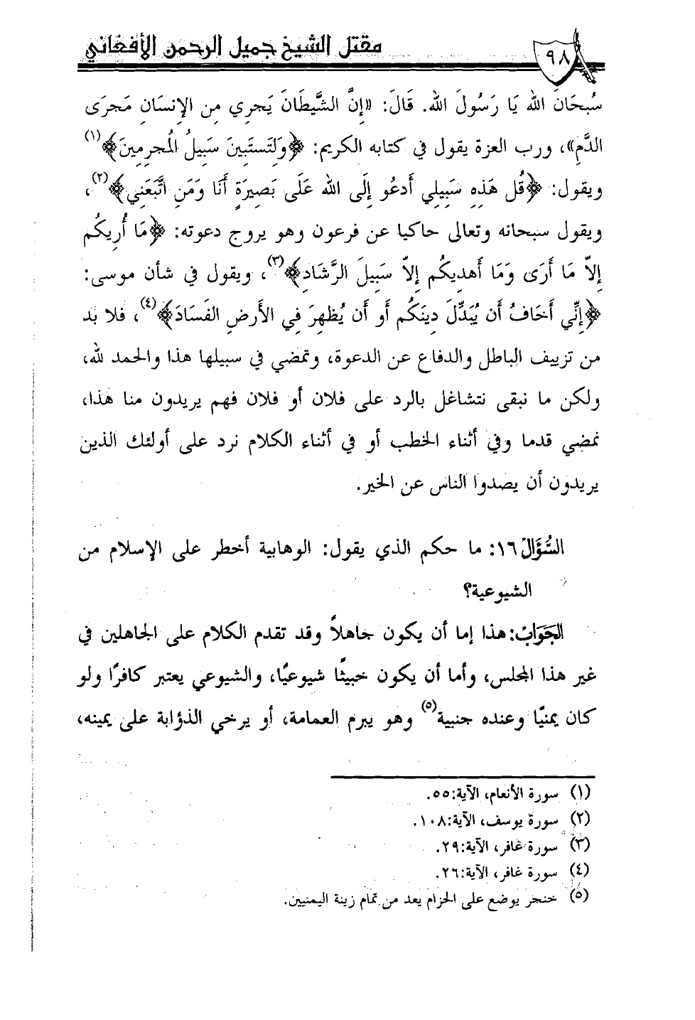 سبحان الله يا رسول الله. قال: ((إنّ الشّيطان يجري من الإنسان مجرى الدّم))، ورب العزة يقول في كتابه الكريم: {ولتستبين سبيل المجرمين (¬1)}، ويقول: {قل هذه سبيلي أدعو إلى الله على بصيرة أنا ومن اتّبعني (¬2)}، ويقول سبحانه وتعالى حاكيا عن فرعون وهو يروج دعوته: {ما أريكم إلاّ ما أرى وما أهديكم إلاّ سبيل الرّشاد (¬3)}، ويقول في شأن موسى: {إنّي أخاف أن يبدّل دينكم أو أن يظهر في الأرض الفساد (¬4)}، فلا بد من تزييف الباطل والدفاع عن الدعوة، وتمضي في سبيلها هذا والحمد لله، ولكن ما نبقى نتشاغل بالرد على فلان أو فلان فهم يريدون منا هذا، نمضي قدما وفي أثناء الخطب أو في أثناء الكلام نرد على أولئك الذين يريدون أن يصدوا الناس عن الخير.