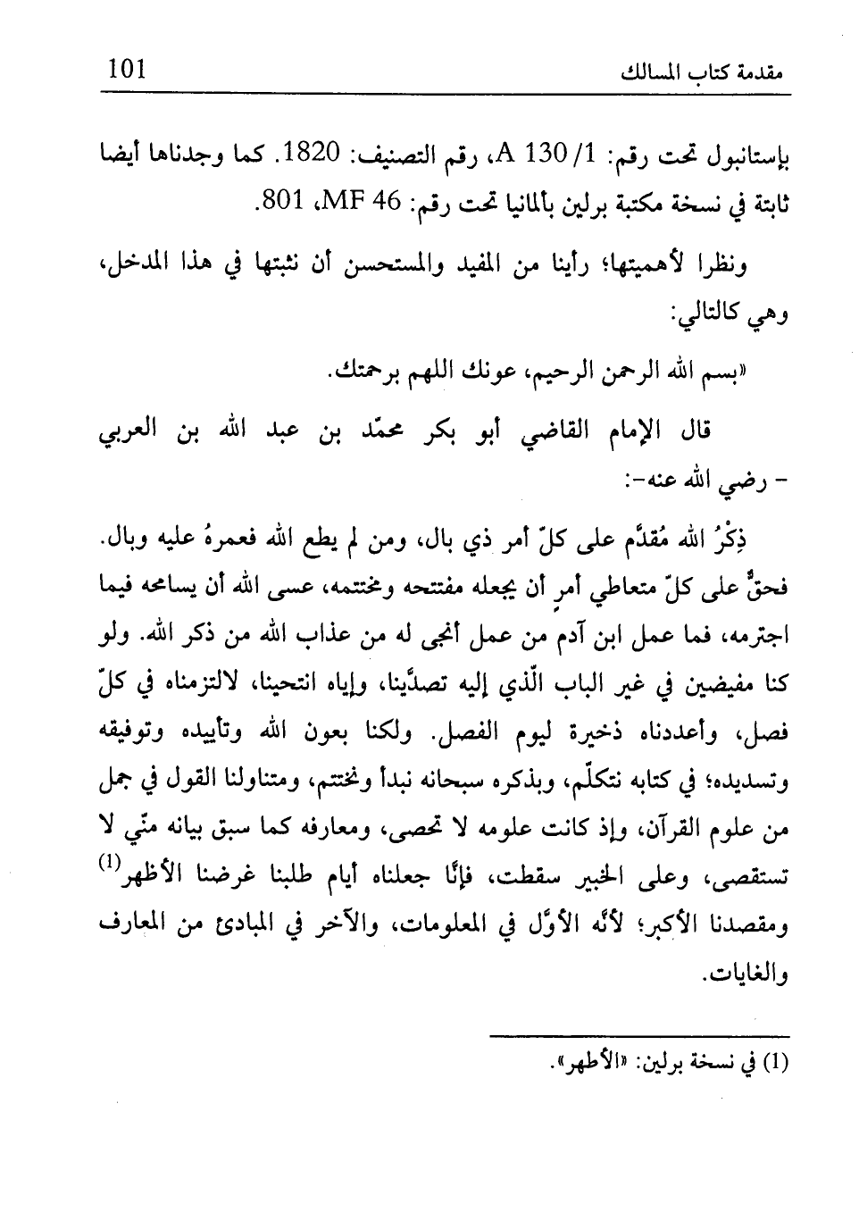 بإستانبول تحت رقم:1/ 130 A، رقم التصنيف: 1820.كما وجدناها أيضًا ثابتة في نسخة مكتبة برلين بألمانيا تحت رقم: 46 MF،801.
