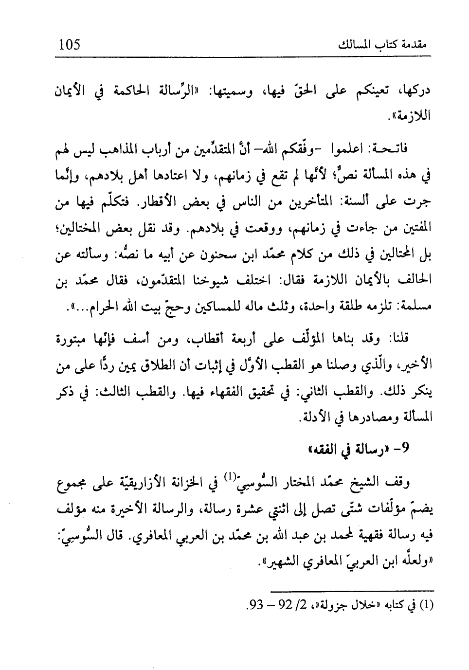فاتحة: اعلموا -وفّقكم الله- أنَّ المتقدِّمين من أرباب المذاهب ليس لهم في هذه المسألة نصٌّ؛ لأنَّها لم تقع في زمانهم، ولا اعتادها أهل بلادهم، وإنَّما جرت على ألسنة: المتأخرين من الناس في بعض الأقطار. فتكلّم فيها من المفتين من جاءت في زمانهم، ووقعت في بلادهم. وقد نقل بعض المختالين؛ بل المحتالين في ذلك من كلام محمّد ابن سحنون عن أبيه ما نصُّه: وسألته عن الحالف بالأيمان اللازمة فقال: اختلف شيوخنا المتقدّمون، فقال محمّد بن مسلمة: تلزمه طلقة واحدة، وثلث ماله للمساكين وحجّ بيت الله الحرام ... ".