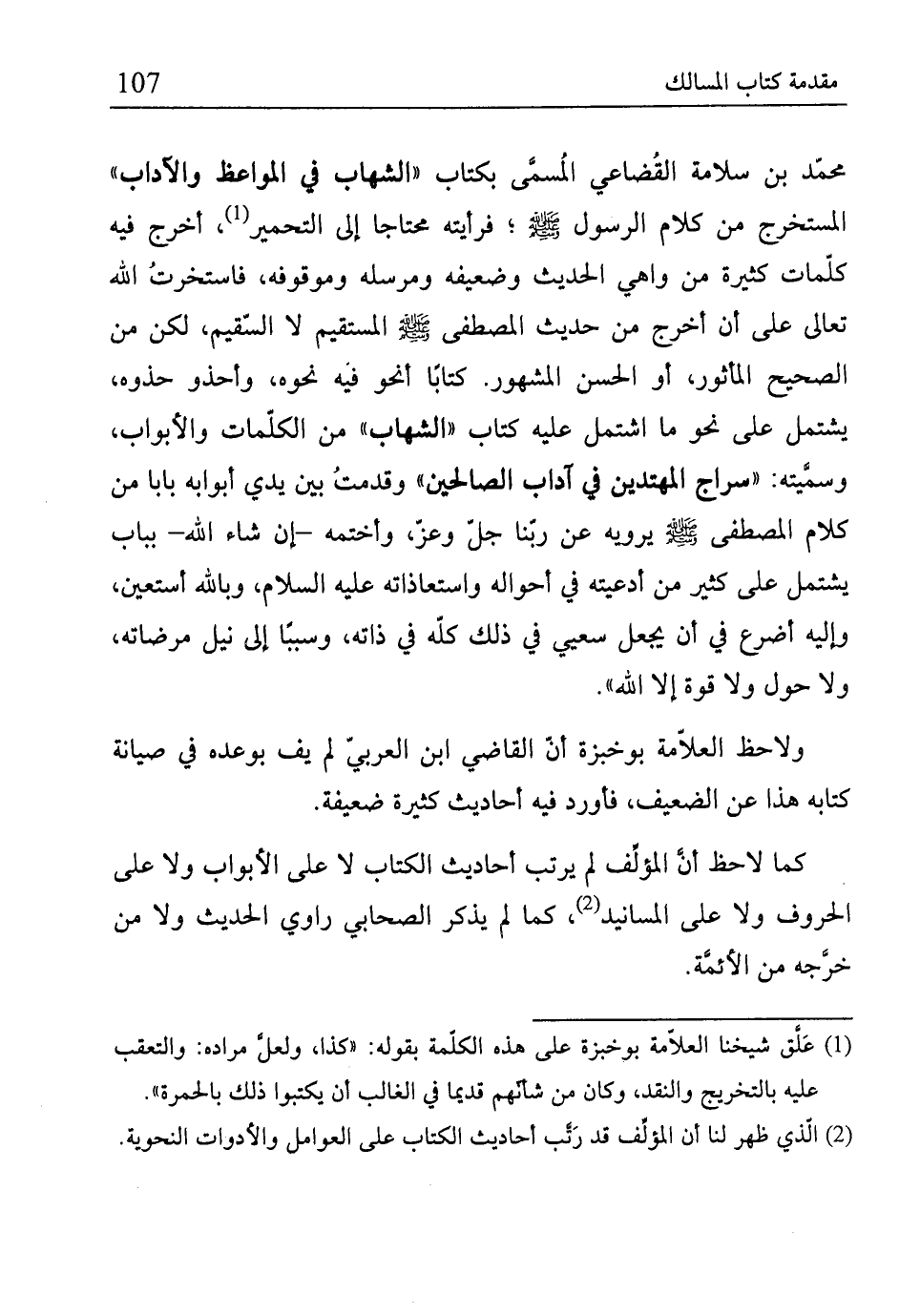 محمّد بن سلامة القُضاعي المُسمَّى بكتاب "الشهاب في المواعظ والآداب" المستخرج من كلام الرسول - صلى الله عليه وسلم -؛ فرأيته محتاجا إلى التحمير (¬1)، أخرج فيه كلّمات كثيرة من واهي الحديث وضعيفه ومرسله وموقوفه، فاستخرتُ الله تعالى على أن أخرج من حديث المصطفى - صلى الله عليه وسلم - المستقيم لا السّقيم، لكن من الصحيح المأثور، أو الحسن المشهور. كتابًا أنحو فيه نحوه، وأحذو حذوه، يشتمل على نحو ما اشتمل عليه كتاب "الشهاب" من الكلّمات والأبواب، وسمَّيته: "سراج المهتدين في آداب الصالحين" وقدمتُ بين يدي أبوابه بابا من كلام المصطفى - صلى الله عليه وسلم - يرويه عن ربّنا جلّ وعزّ، وأختمه -إن شاء الله- بباب يشتمل على كثير من أدعيته في أحواله واستعاذاته -عليه السلام-، وبالله أستعين، وإليه أضرع في أن يجعل سعيي في ذلك كلّه في ذاته، وسببًا إلى نيل مرضاته، ولا حول ولا قوة إلا الله".