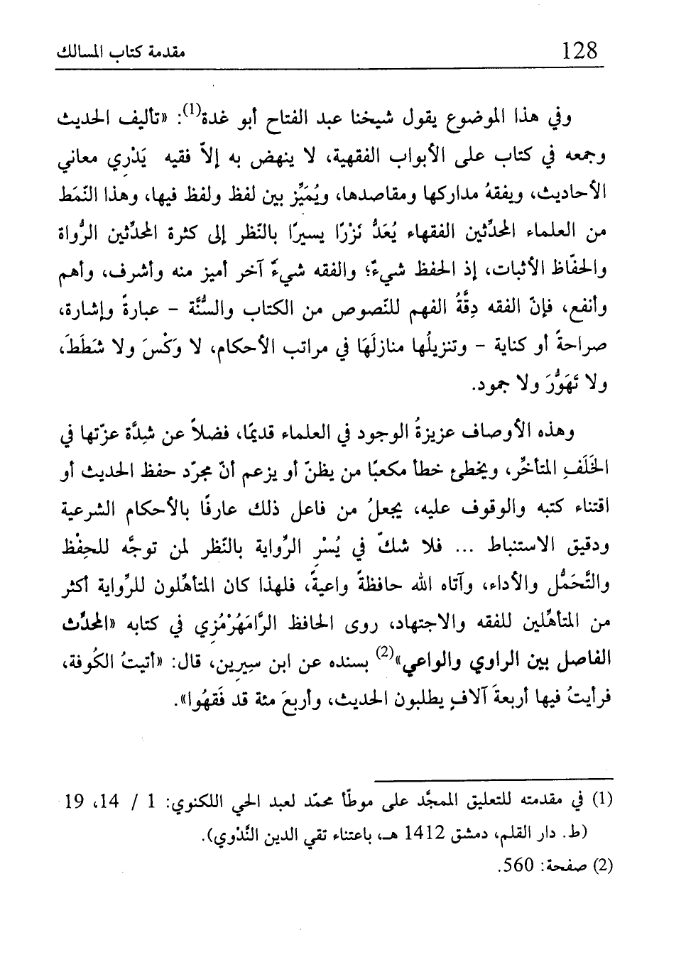 وفي هذا الموضوع يقول شيخنا عبد الفتاح أبو غدة (¬1): "تأليف الحديث وجمعه في كتاب على الأبواب الفقهية، لا ينهض به إلَّا فقيه يَدْرِي معاني الأحاديث، ويفقهُ مداركها ومقاصدها، ويُمَيِّز بين لفظ ولفظ فيها، وهذا النّمَط من العلماء المحدِّثين الفقهاء يُعَدُّ نَزْرًا يسيرَا بالنّظر إلى كثرة المحدِّثين الرُّواة والحفّاظ الأثبات، إذ الحفظ شيءٌ؛ والفقه شيءٌ آخر أميز منه وأشرف، وأهم وأنفع، فإنّ الفقه دِقَّةُ الفهم للنّصوص من الكتاب والسُّنَّة - عبارةً وإشارة، صراحةً أو كناية - وتنزيلُها منازلَهَا في مراتب الأحكام، لا وَكْسَ ولا شَطَطَ، ولا تَهَوُّرَ ولا جمود.
