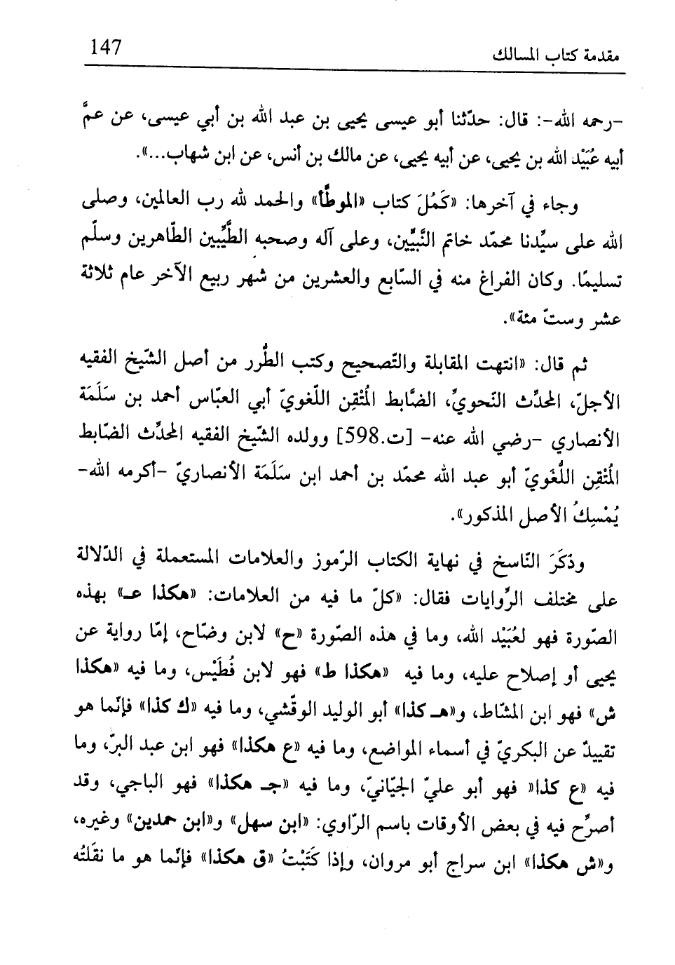 وذكَرَ النّاسخ في نهاية الكتاب الرّموز والعلامات المستعملة في الدّلالة على مختلف الرِّوايات فقال: "كلّ ما فيه من العلامات: "هكذا عـ" بهذه الصّورة فهو لعُبَيْد الله وما في هذه الصّورة "ح" لابن وضّاح، إمّا رواية عن يحيى أو إصلاح عليه، وما فيه "هكذا ط " فهو لابن فُطَيْس، وما فيه "هكذا ش" فهو ابن المشّاط، و"هـ كذا" أبو الوليد الوقّشي، وما فيه "ك كذا" فإنّما هو تقييدٌ عن البكريّ في أسماء المواضع، وما فيه "ع هكذا" فه وابن عبد البرّ، وما فيه "ع كذا" فهو أبو علىّ الجيّانيّ، وما فيه "جـ هكذا" فهو الباجي، وقد أصرِّح فيه في بعض الأوقات باسم الرّاوي: "ابن سهل" و"ابن حمدين" وغيره، و"ش هكذا" ابن سراج أبو مروان، وإذا كَتَبْتُ "ق هكذا" فإنّما هو ما نقَلتُه