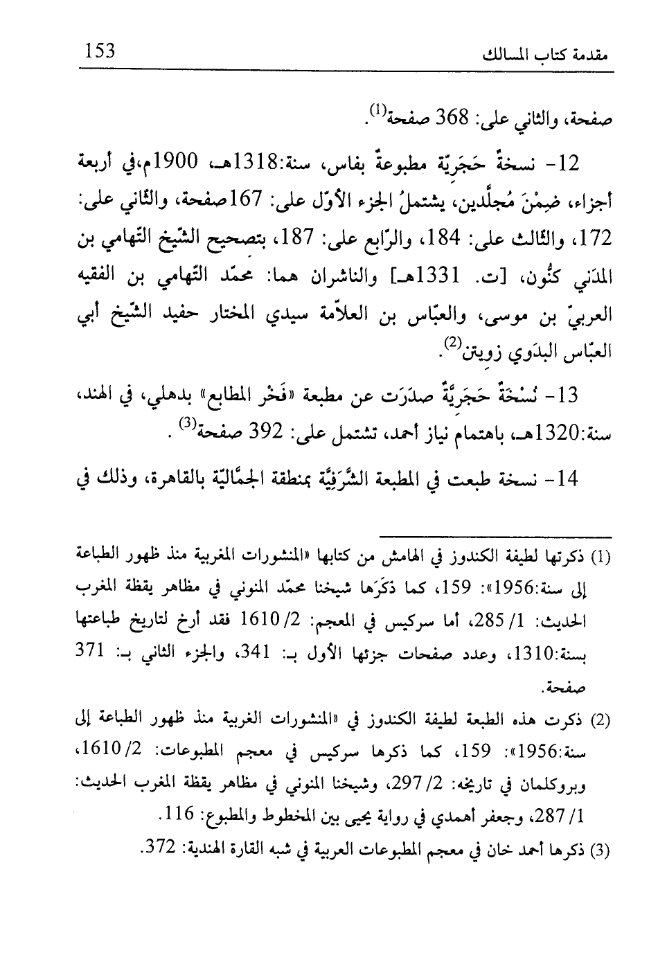 (¬1) ذكرتها لطيفة الكندوز في الهامش من كتابها "المنشورات الغربية منذ ظهور الطباعة إلى سنة:1956": 159، كما ذكَرَها شيخنا محمّد النوني في مظاهر يقظة المغرب الحديث: 1/ 285، أما سركيس في المعجم: 2/ 1610 فقد أرخ لتاريخ طباعتها بسنة: 1310، وعدد صفحات جزئها الأول بـ 341 والجزء الثاني بـ 371 صفحة.