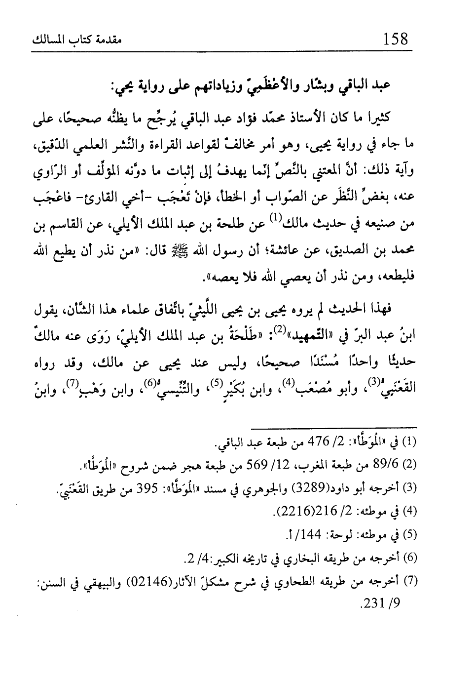 كثيرا ما كان الأستاذ محمّد فؤاد عبد الباقي يُرجِّح ما يظنُّه صحيحًا، على ما جاء في رواية يحيى، وهو أمر مخالفٌ لقواعد القراءة والنَّشر العلمي الدّقيق، وآية ذلك: أنَّ المعتني بالنَّصِّ إنّما يهدفُ إلى إثبات ما دوَّنه المؤلِّف أو الرّاوي عنه، بغضِّ النَّظَر عن الصّواب أو الخطأ، فإنْ تَعْجَب -أخي القارئ - فاعْجَب من صنيعه في حديث مالك (¬1) عن طلحة بن عبد الملك الأيلي، عن القاسم بن محمد بن الصديق، عن عائشة؛ أن رسول الله -صلى الله عليه وسلم- قال: "من نذر أن يطيع الله فليطعه، ومن نذر أن يعصي الله فلا يعصه".