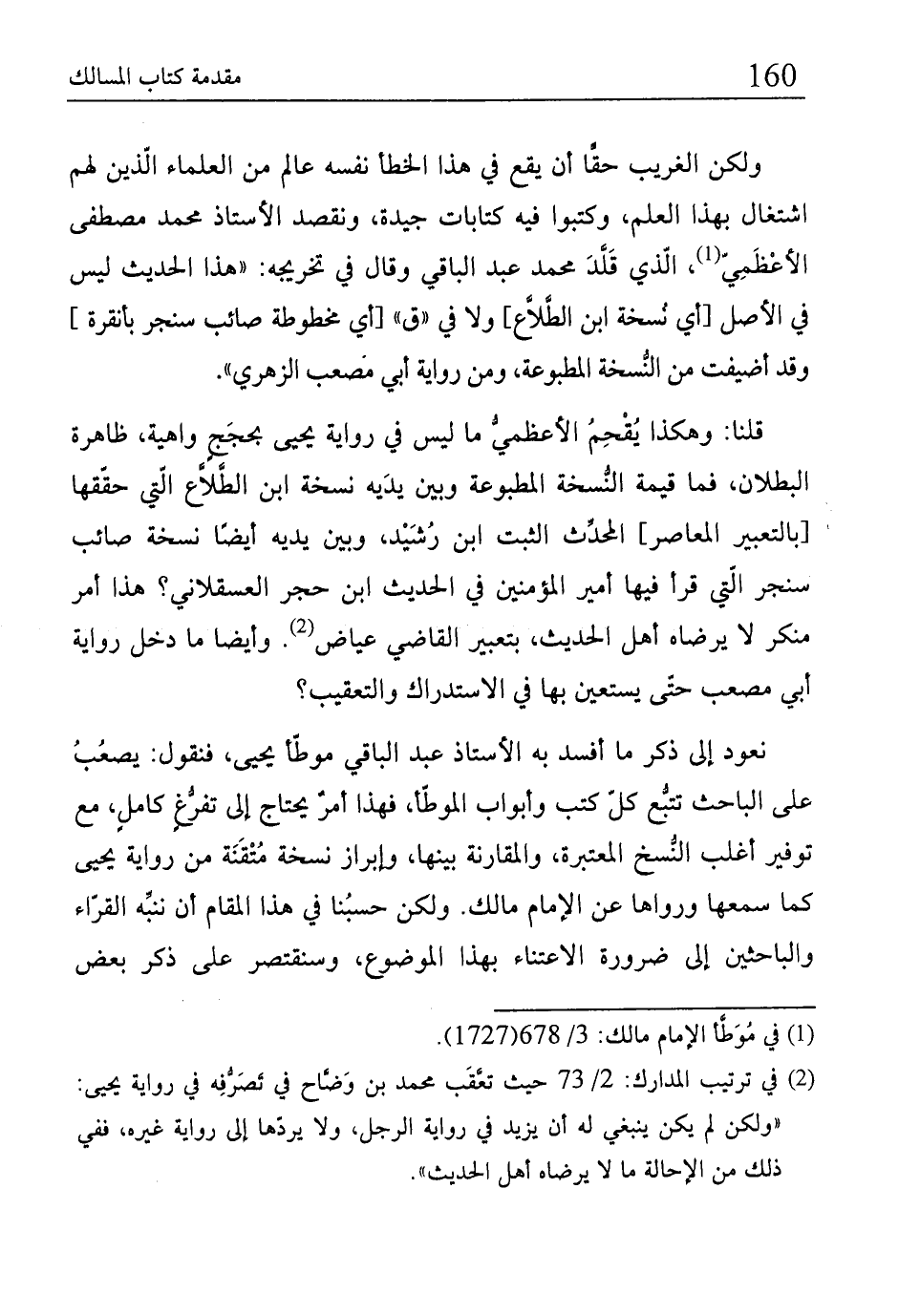قلنا: وهكذا يُقْحِمُ الأعظميُّ ما ليس في رواية يحيى بحجَجٍ واهية، ظاهرة البطلان، فما قيمة النُّسخة المطبوعة وبين يديه نسخة ابن الطَّلاَّع الَّتي حقّقها [بالتعبير المعاصر] المحدِّث الثبت ابن رُشَيْد، وبين يديه أيضًا نسخة صائب سنجر الَّتي قرأ فيها أمير المؤمنين في الحديث ابن حجر العسقلاني؟ هذا أمر منكر لا يرضاه أهل الحديث، بتعبير القاضي عياض (¬2). وأيضًا ما دخل رواية أبي مصعب حتى يستعين بها في الاستدراك والتعقيب؟