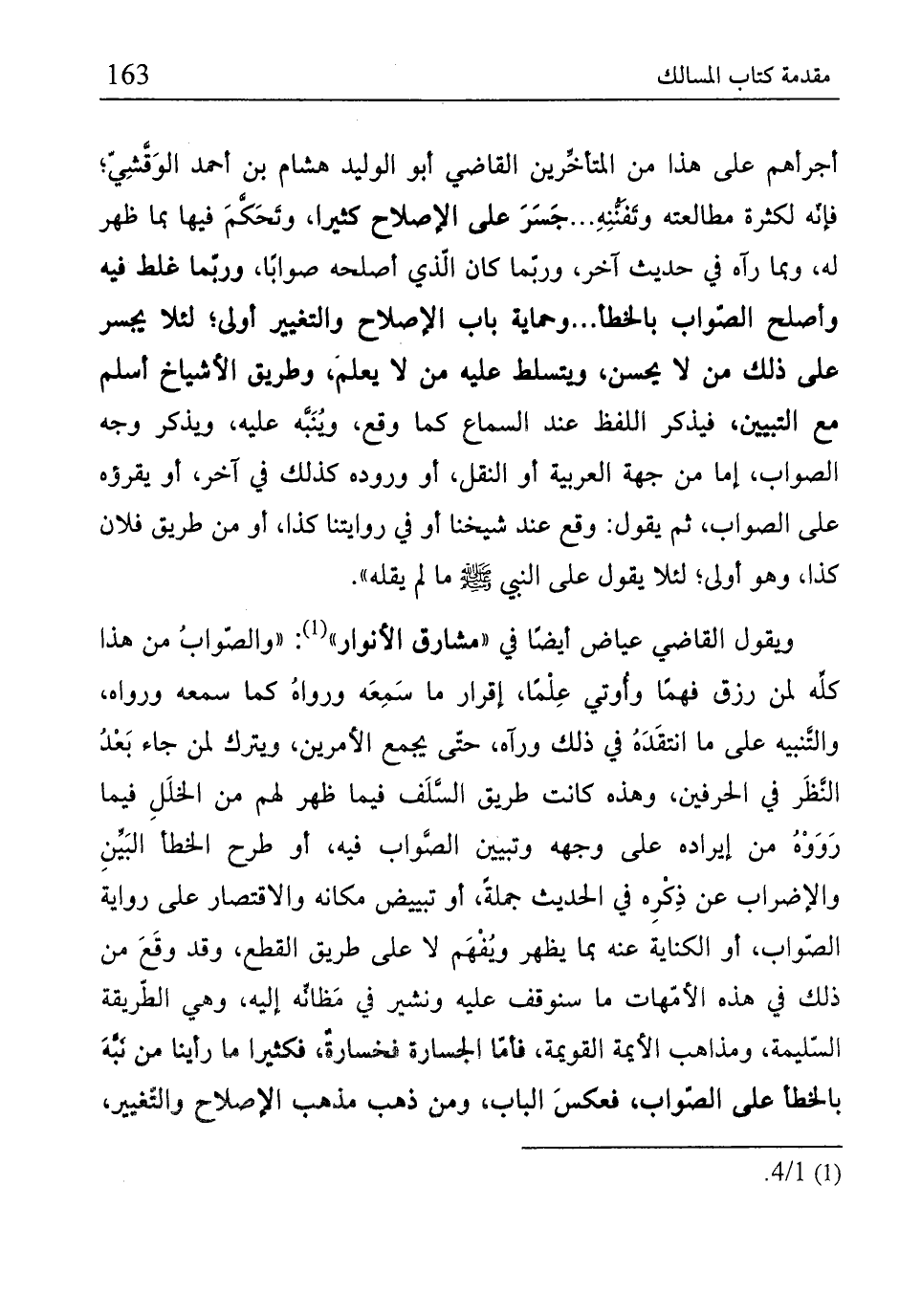 ويقول القاضي عياض أيضًا في "مشارق الأنوار" (¬1): "والصّوابُ من هذا كلَّه لمن رزقا فهمًا وأُوتي عِلْمًا، إقرار ما سَمِعَه ورواهُ كما سمعه ورواه، والتَّنبيه على ما انتقَدَهُ في ذلك ورآه، حتّى يجمع الأمرين، ويترك لمن جاء بَعْدُ النَّظَر في الحرفين، وهذه كانت طريق السَّلَف فيما ظهر لهم من الخلَلِ فيما رَوَوْهُ من إيراده على وجهه وتبين الصَّواب فيه، أو طرح الخطأ البَيِّنِ والإضراب عن ذِكْرِه في الحديث جملةً، أو تبييض مكانه والاقتصار على رواية الصّواب، أو الكناية عنه كما يظهر ويُفْهَم لا على طريق القطع، وقد وقَعَ من ذلك في هذه الأمّهات ما سنوقف عليه ونشير في مَظانِّه إليه، وهي الطّريقة السّليمة، ومذاهب الأيمة القويمة، فأمّا الجسارة فجسارةٌ، فكثيرا ما رأينا من نَبَّهَ بالخطأ على الصّواب، فعكسَ الباب، ومن ذهب مذهب الإصلاح والتّغيير،