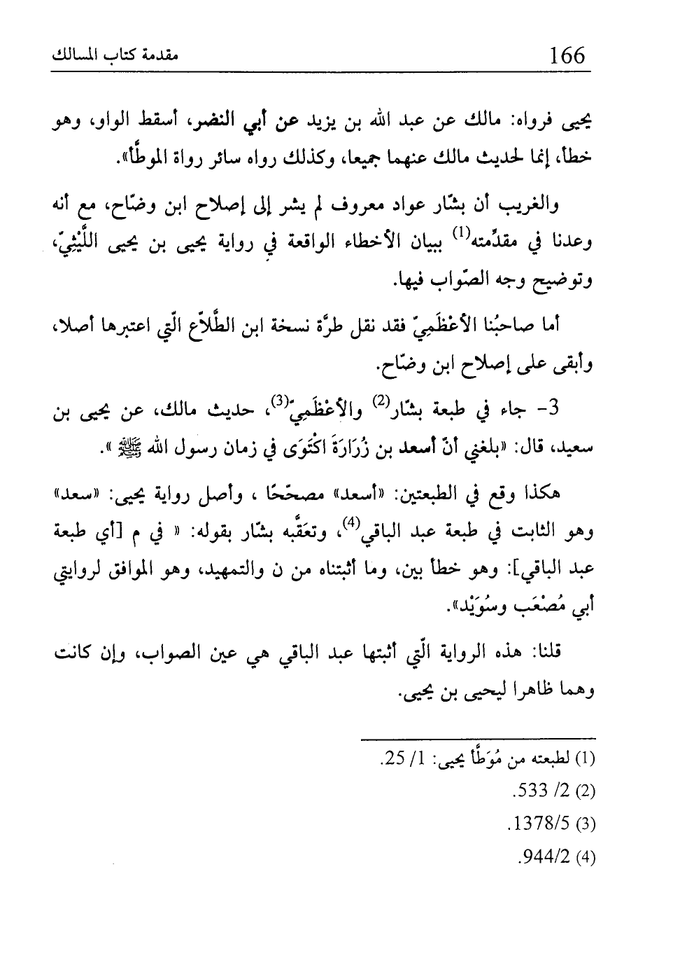 والغريب أن بشّار عواد معروف لم يشر إلى إصلاح ابن وضّاح، مع أنه وعدنا في مقدِّمته (¬1) ببيان الأخطاء الواقعة في رواية يحيى بن يحيى اللَّيْثِيّ، وتوضيح وجه الصّواب فيها.