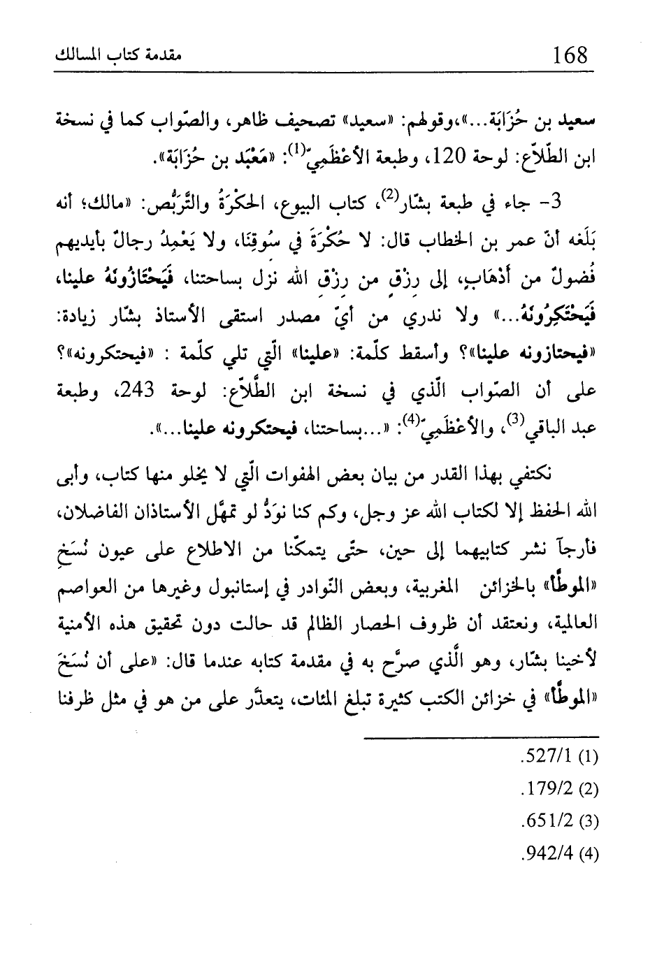3 - جاء في طبعة بشّار (¬2)، كتاب البيوع، الحكْرَةُ والتَّرَبُّص: "مالك؛ أنه بَلَغه أنّ عمر بن الخطاب قال: لا حُكرَةَ في سُوقِنَا، ولا يَعْمِدُ رجالٌ بأيديهم فُضولٌ من أَذهَابٍ، إلى رِزْقٍ من رِزْقِ الله نزل بساحتنا، فَيَحْتَازُونَهُ علينا، فَيَحْتَكِرُونَهُ ... " ولا ندري من أيّ مصدر استقى الأستاذ بشّار زيادة: "فيحتونه علينا"؟ وأسقط كلّمة: "علينا" الَّتي تلي كلّمة: "فيحتكرونه"؟ على أن الصّواب الَّذي في نسخة ابن الطَّلّاع: لوحة 243، وطبعة عبد الباقي (¬3)، والأغظَمِيَ (¬4): " ... بساحتنا، فيحتكرونه علينا ... ".