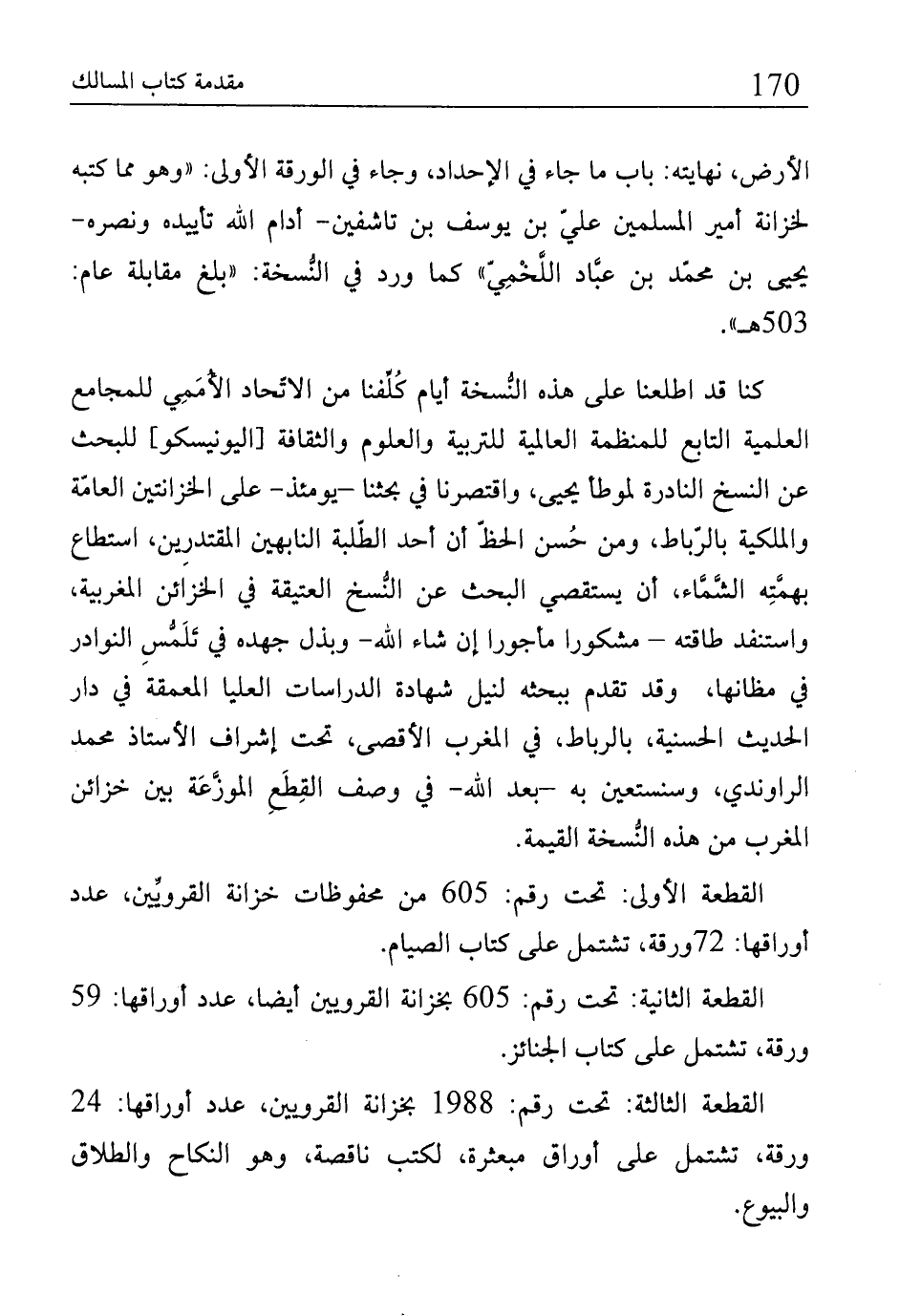 الأرض، نهايته: باب ما جاء في الإحداد، وجاء في الورقة الأولى: "وهو مما كتبه لخزانة أمير المسلمين عليّ بنيوسف بن تاشفن -أدام الله تأييده ونصره- يحيى بن محمْد بن عبَّاد اللَّخْمِيّ" كما ورد في النسخة: "بلغ مقابلة عام: 503 هـ".