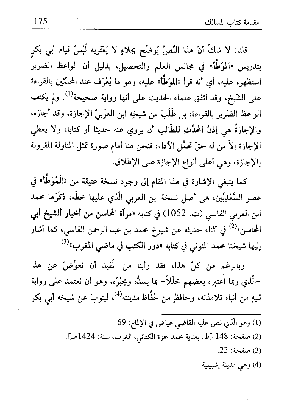 كما ينبغي الإشارة في هذا المقام إلى وجود نسخة عتيقة من "المُوَطَّأ" في عصر السَّعْدِيِّين، هي أصل نسخة ابن العربيّ الَّذي عليها خطّه، ذَكَرَها محمد ابن العربيّ الفاسي (ت. 1052) في كتابه "مرآة المحاسن من أخبار الشيخ أبي المحاسن" (¬2) في أثناء حديثه عن شيوخ محمد بن عبد الرحمن الفاسي، كما أشار إليها شيخنا محمد المنوني في كتابه "دور الكتب في ماضي المغرب" (¬3)